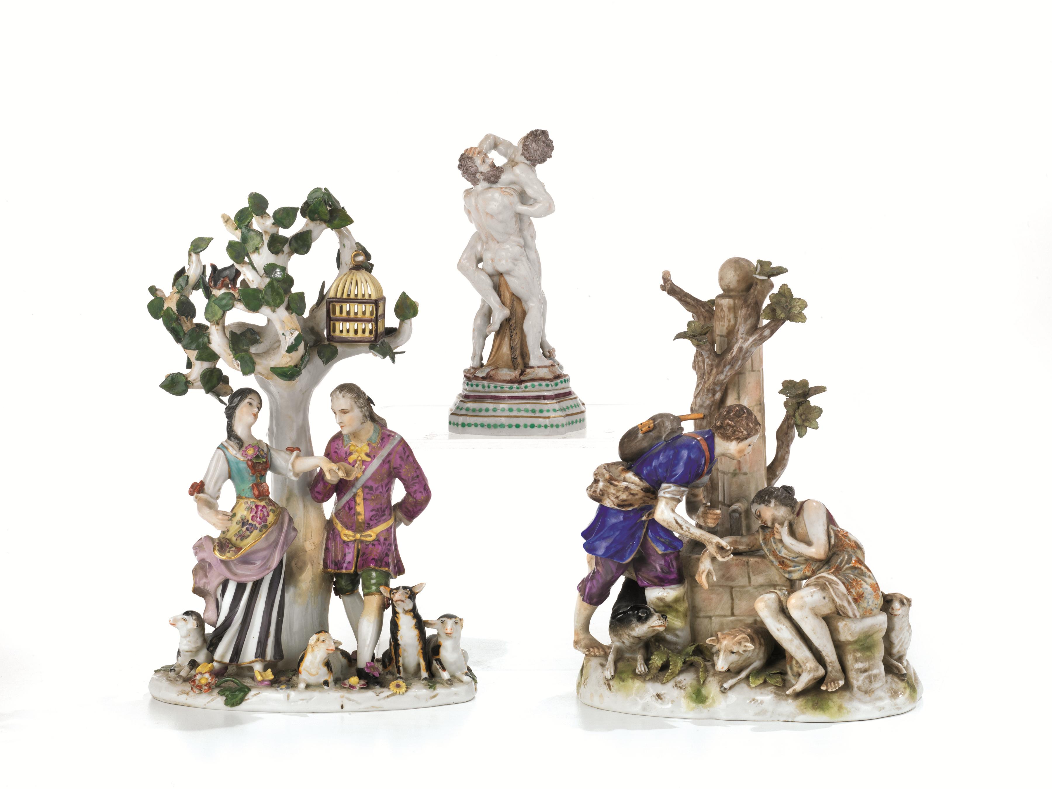 in porcellana policroma raffiguranti rispettivamente scena campestre, due lottatori e pastorelli, alt. cm 20; 23 e 15, piccole mancanze (3)