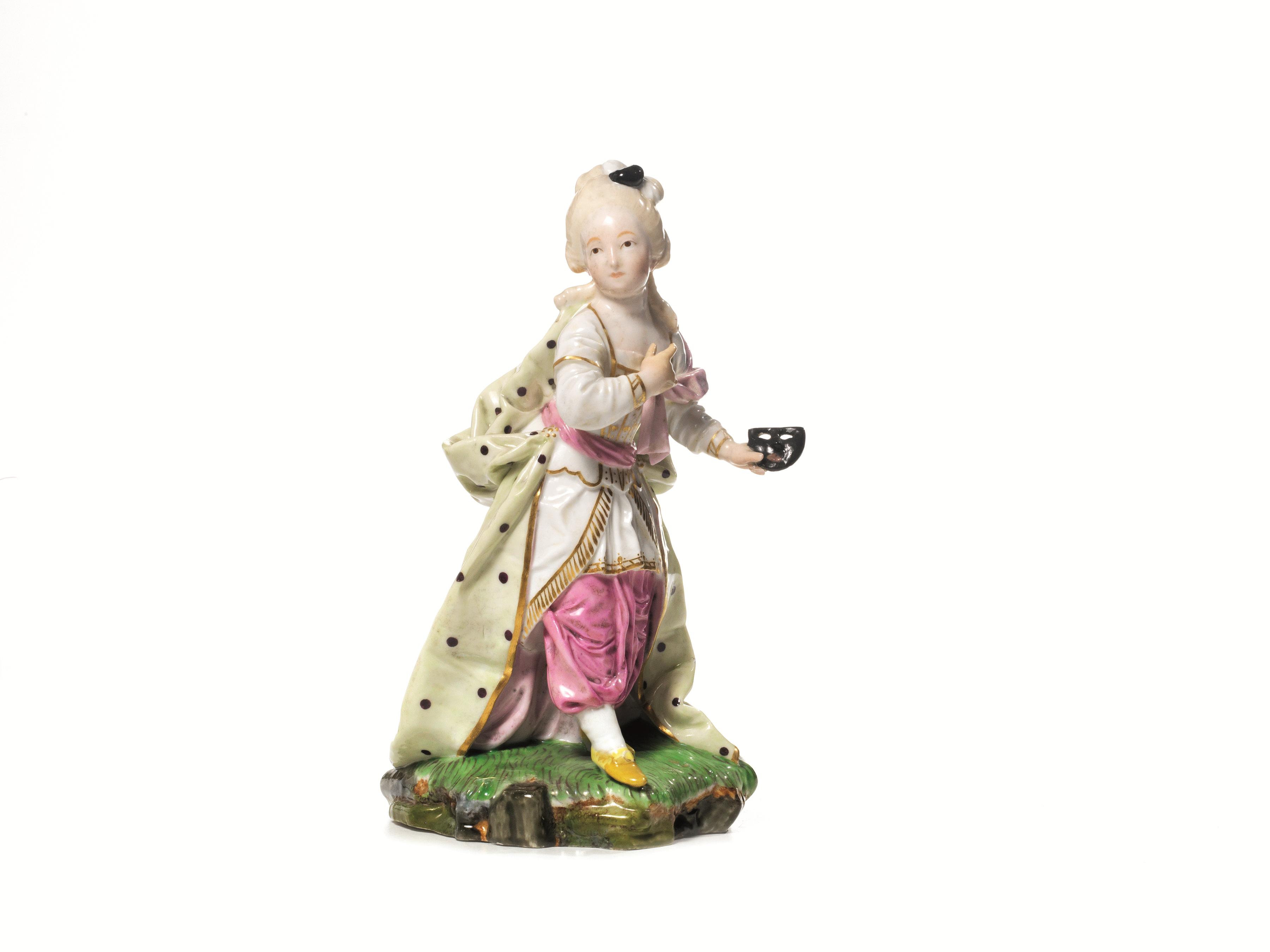 in porcellana policroma raffigurante “fanciulla con maschera”, alt. cm 17