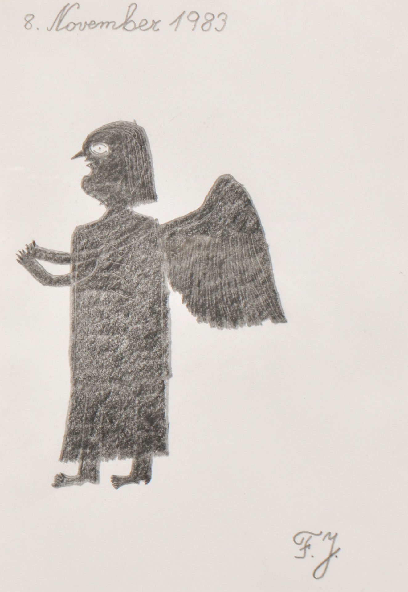 Franz Kernbeis (Prigglitz 1935 - Gugging 2019) Angelo, 1983;Gessetti neri, matita, 29 x 20 cm, in cornice