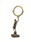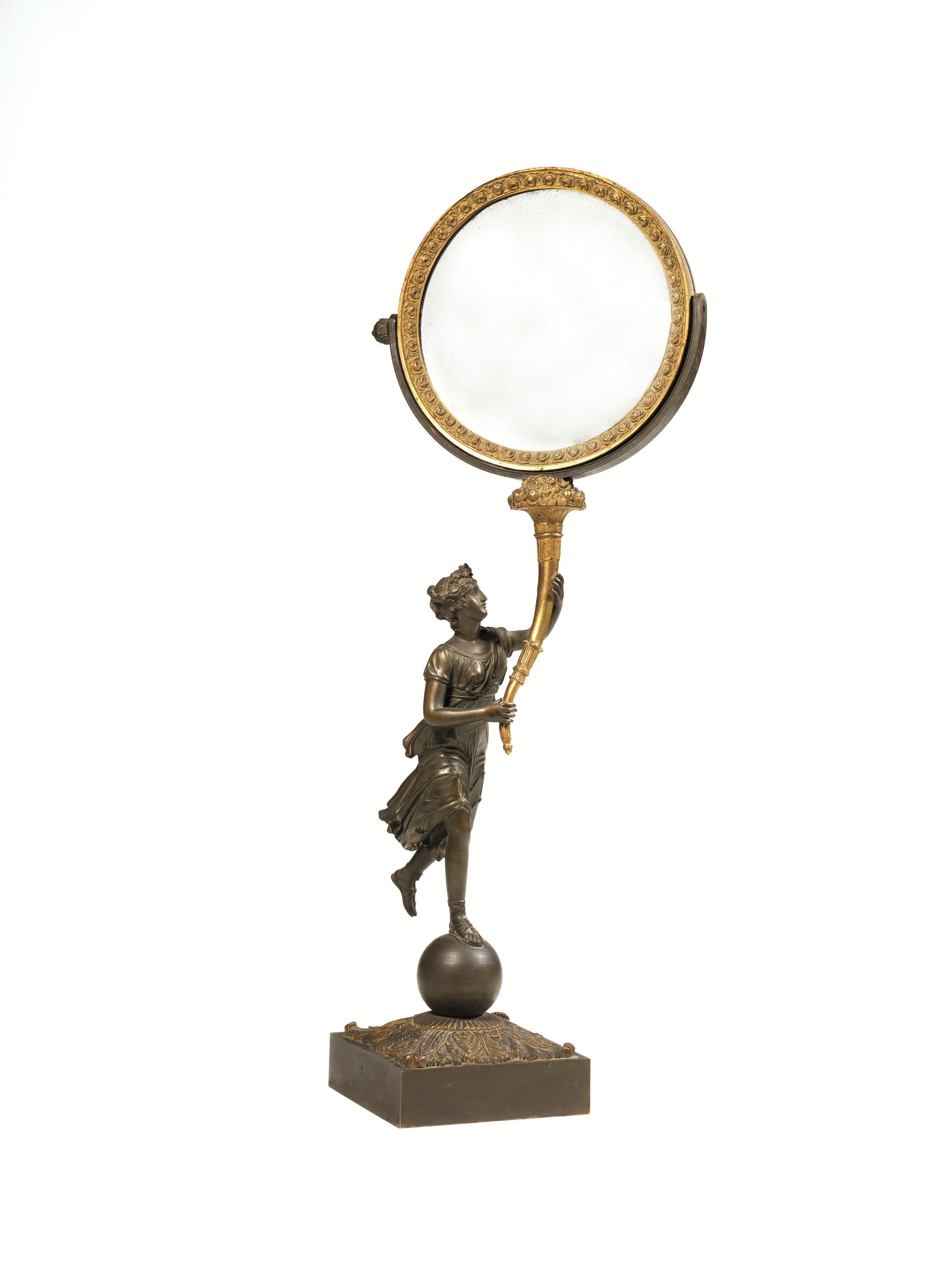 in bronzo dorato e brunito, base quadrata su cui poggia una figura femminile nell'atto di sostenere una cornucopia su cui poggia la specchiera circolare, alt. cm 52
