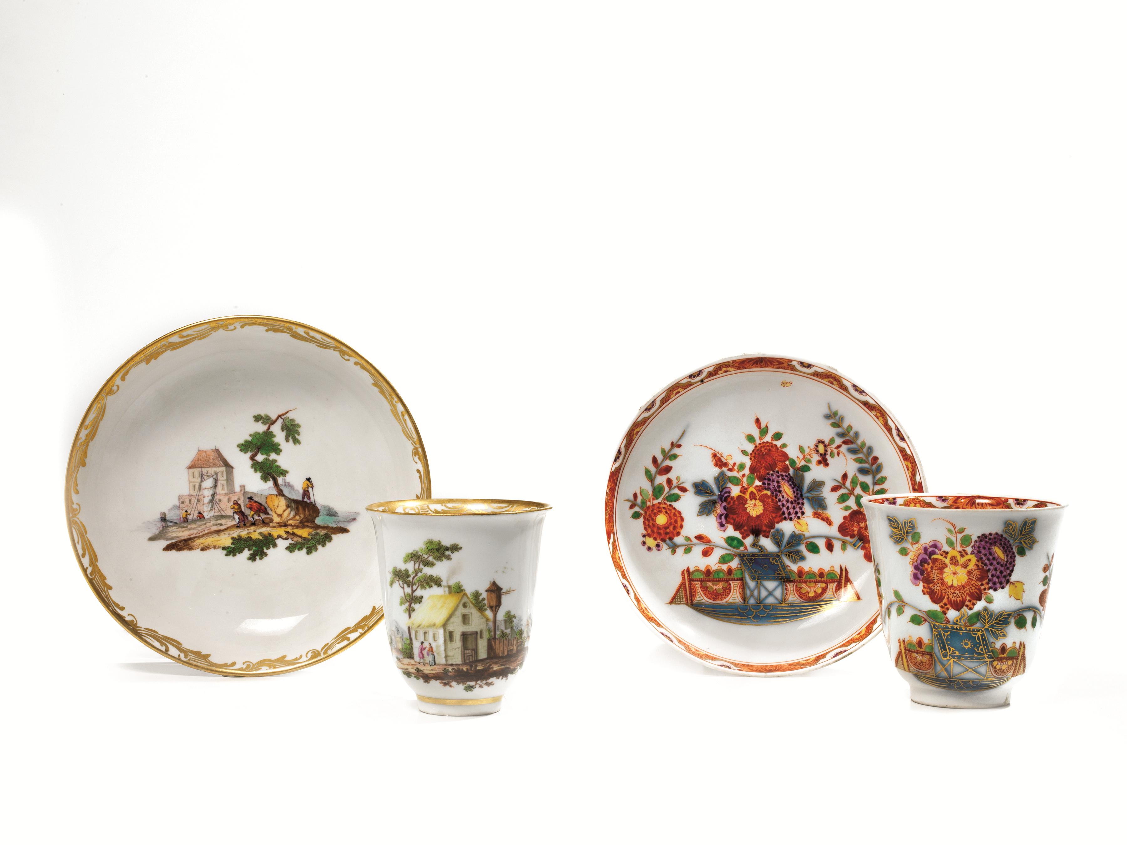 TAZZINA CON PIATTINO, MANIFATTURA DI MEISSEN, SECONDA METà SECOLO XVIII, in porcellana dipinta in policroma, tazzina alt. cm 7,5, piattino diam. cm 13 (2]