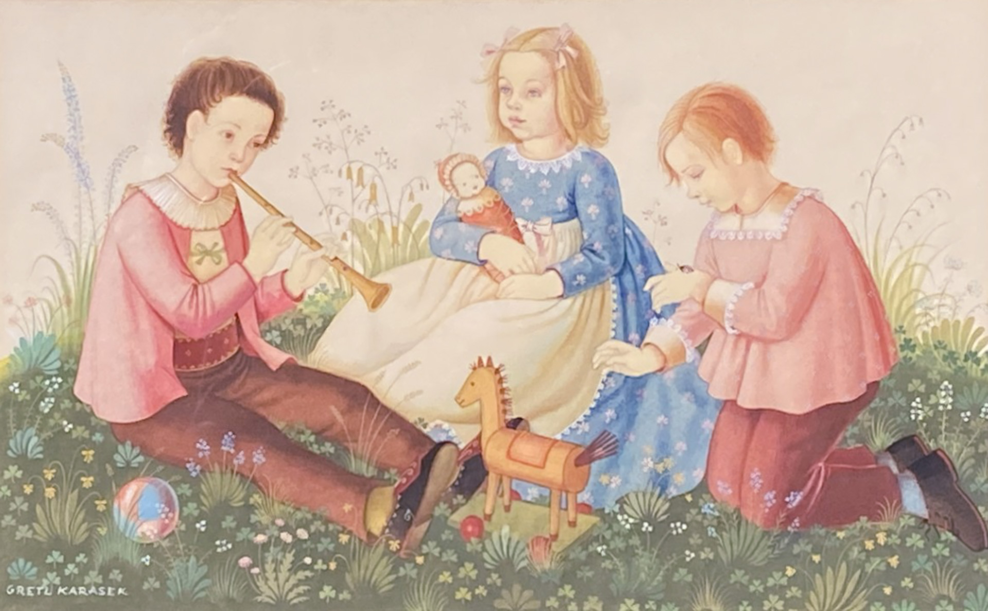 Gretl Karasek (Innsbruck 1910 - 1992) Tre bambini che giocano;Tempera su carta, 28 x 45 cm, in cornice