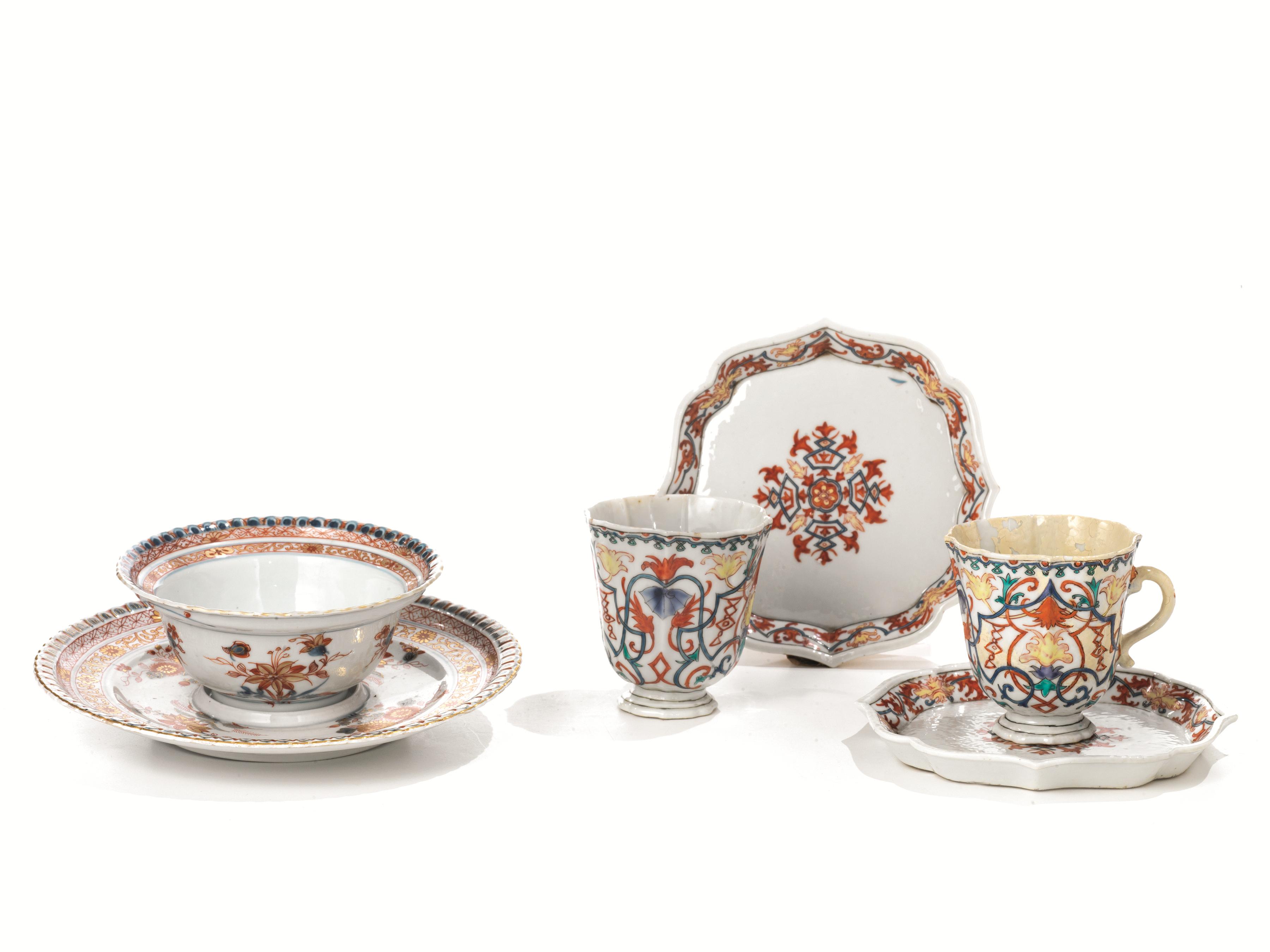 in porcellana decorata da fiori e foglie nei toni del rosso, del blu e del giallo e