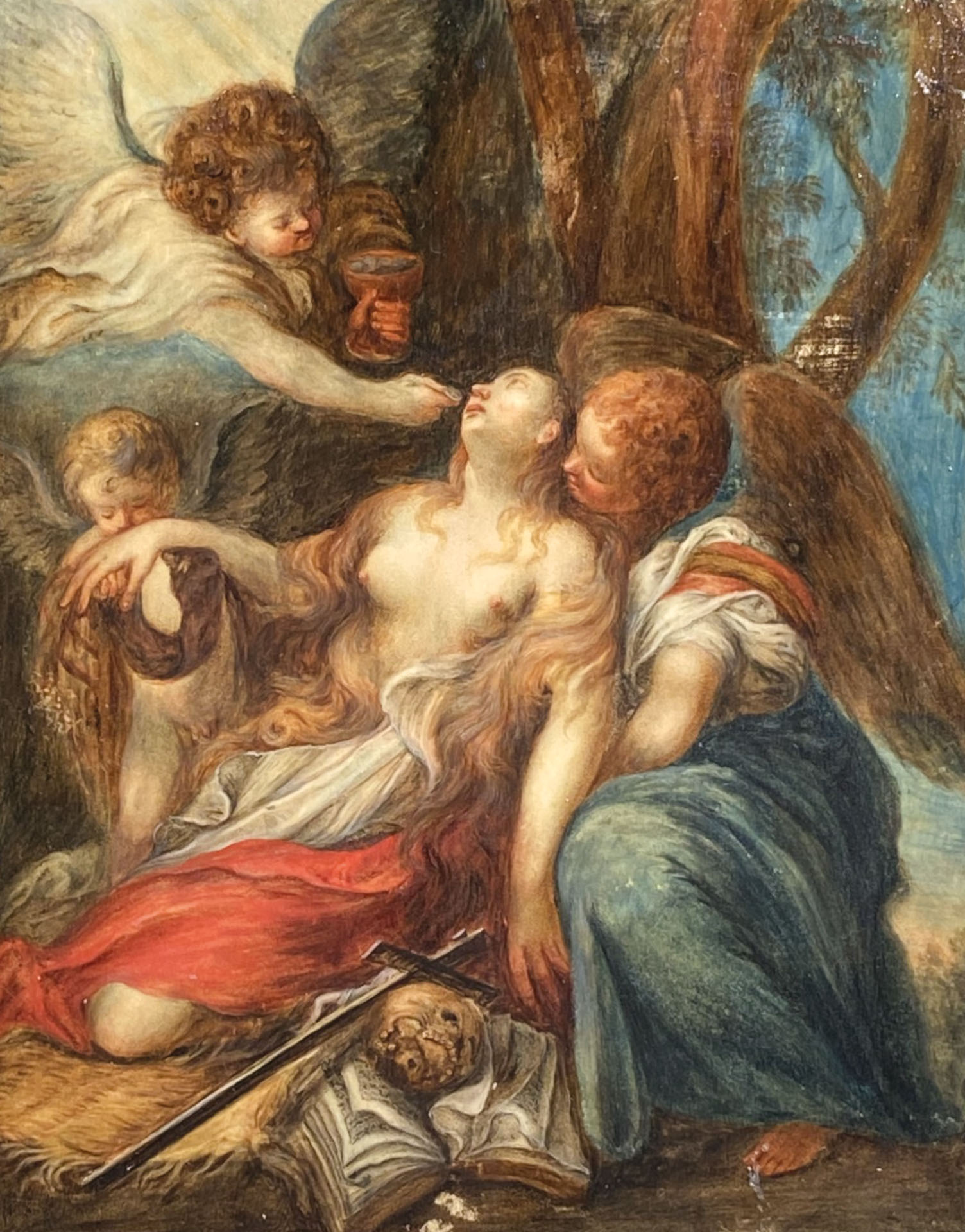 Maler des 17. Jh./Pittore del XVII secolo Santa Maddalena con angeli;Olio su carta su metallo, 20,6 x 16,4 cm