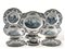 18 piatti fondi; 18 piatti piani; 18 piatti da frutta; 10 tazze da tè con 10 piattini; 4 tazze da caffè con 13 piattini; 4 piccoli piatti fondi; 1 antipastiera a tre alloggi; 1 vassoio ovale e 2 insalatiere