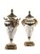 in biscuit con montatura in bronzo dorato, corpo decorato con putti giocosi, anse modellate come teste di caprone riunite da festoni di fiori, presa a pigna, marca sul fondo con lettera T, alt. cm 41,5, uno con piede restaurato
