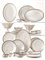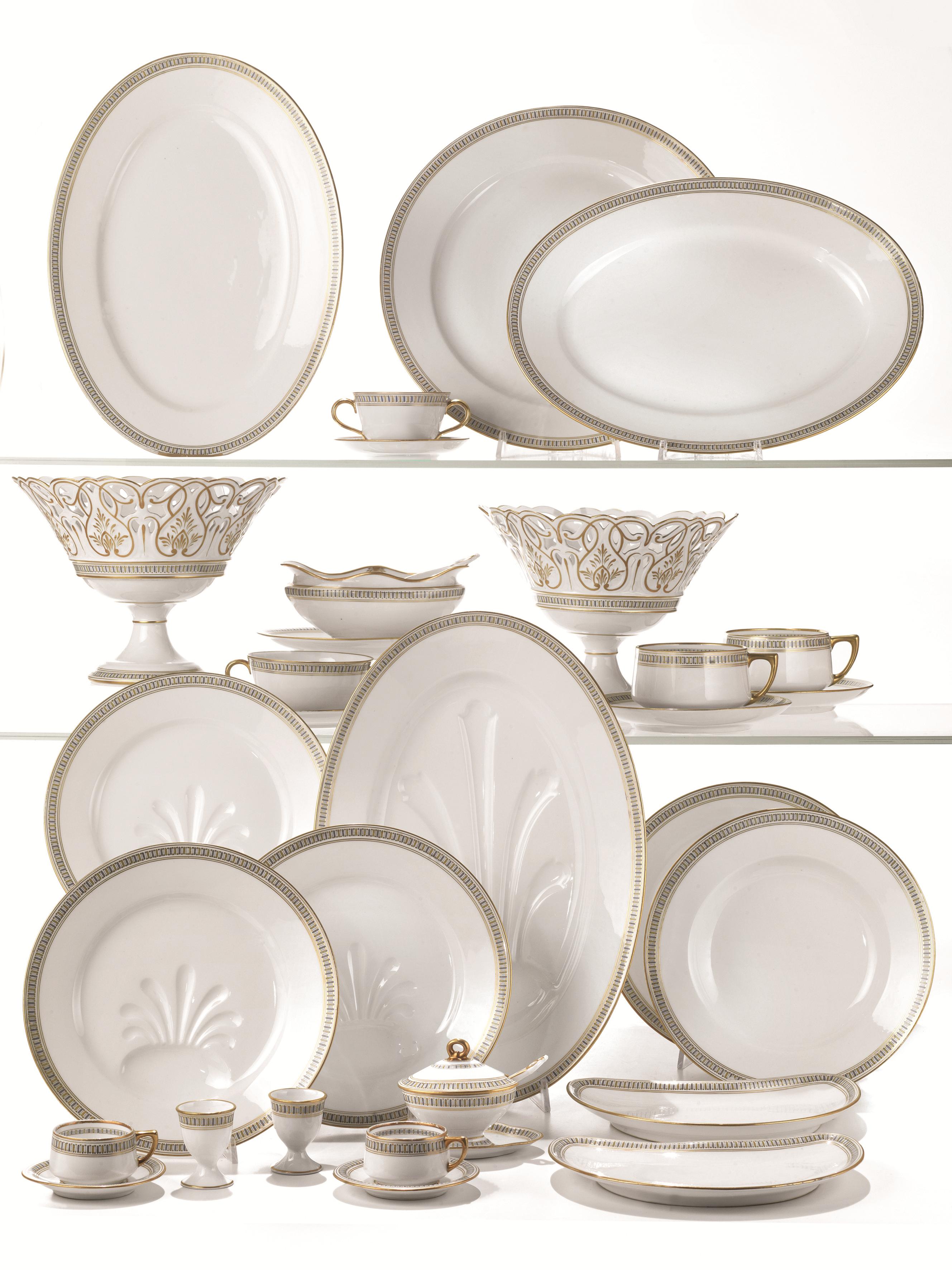Composizione: 16 piatti fondi; 32 piatti piani; 18 piattini da frutta; 15 piattini da dessert; 18 piatti da arrosto; 16 tazze da brodo; 2 raviere, 1 salsiera con ramaiolo, 2 mostardiere; 1 pescera; 2 vassoi circolari; 2 alzate alte; 2 alzate basse; 1 vassoietto a due anse; 1 insalatiera; 1 vassoio da arrosto; 6 vassoi ovali di diverse misure; 2 alzate traforate; 8 mezze lune; 12 porta uovo; 1 teiera, 1 caffettiera, 1 zuccheriera. 1 lattiera, 11 tazze con 11 piattini da cioccolata; 16 tazzine da tè con 16 piattini; 16 tazzine da caffè con 16 piattini, 1 zuppiera ovale
