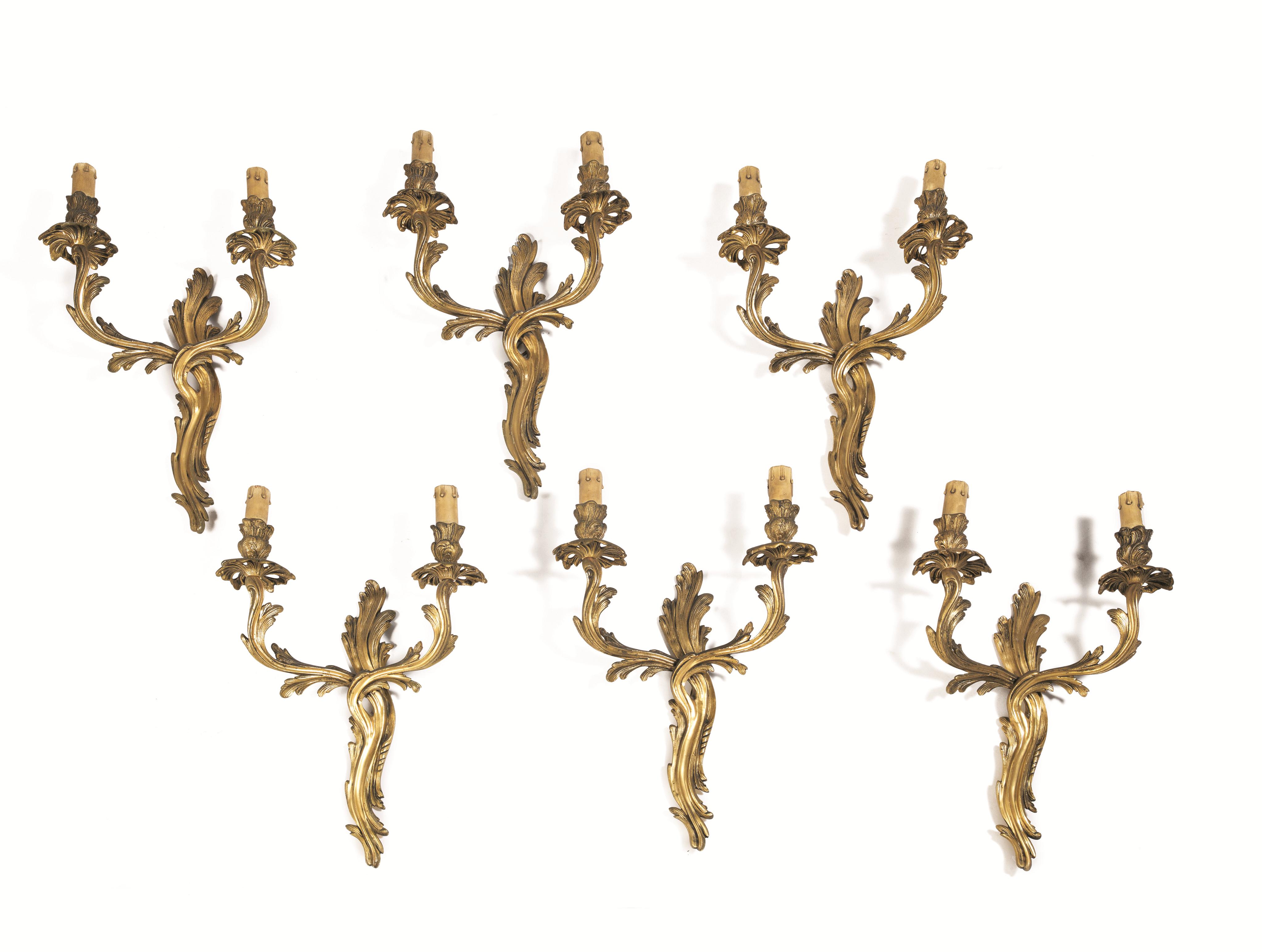 Lot 519 | SEI APPLIQUES, FINE SECOLO XIXin bronzo dorato, ciascuno a due bracci...