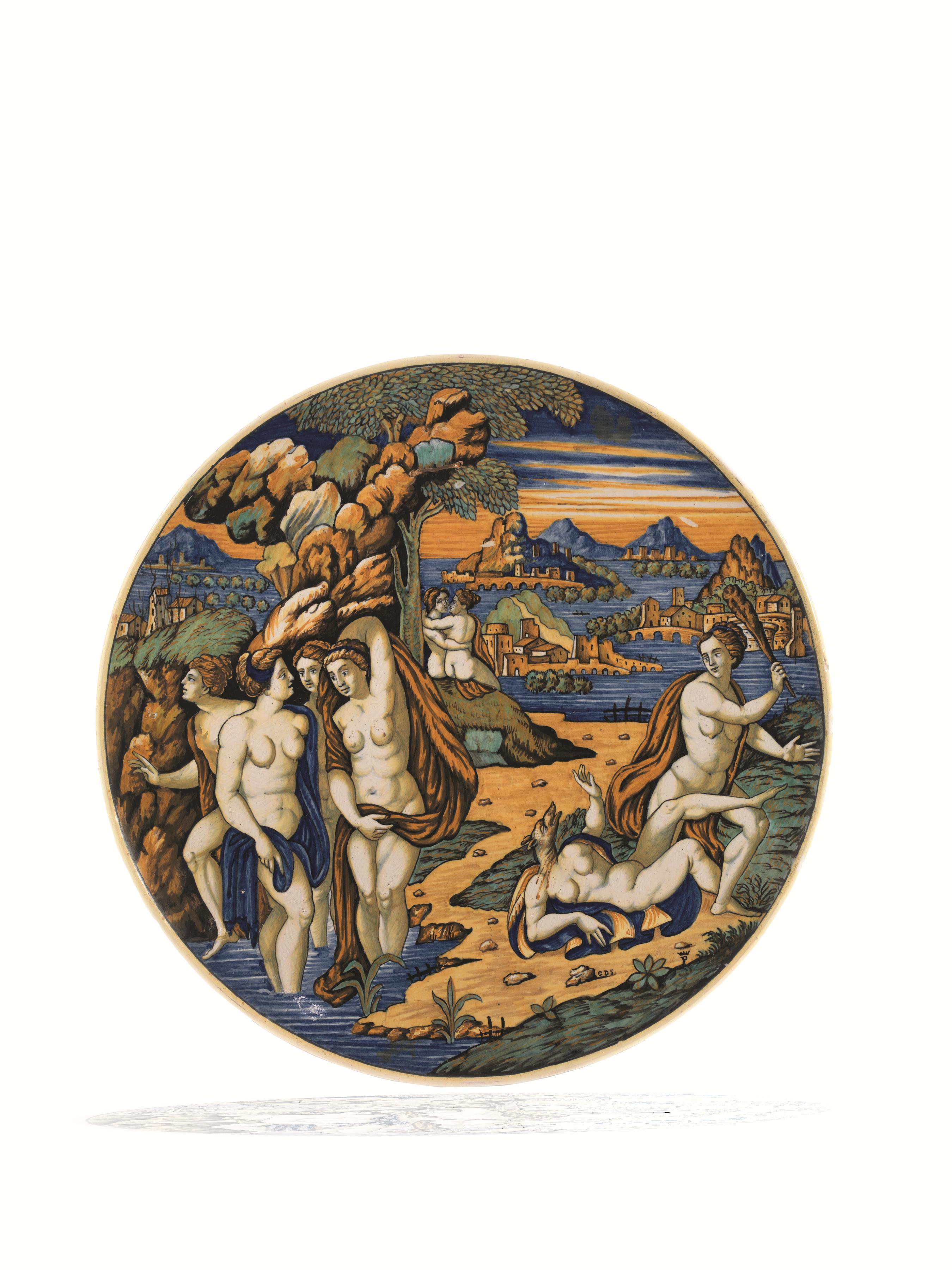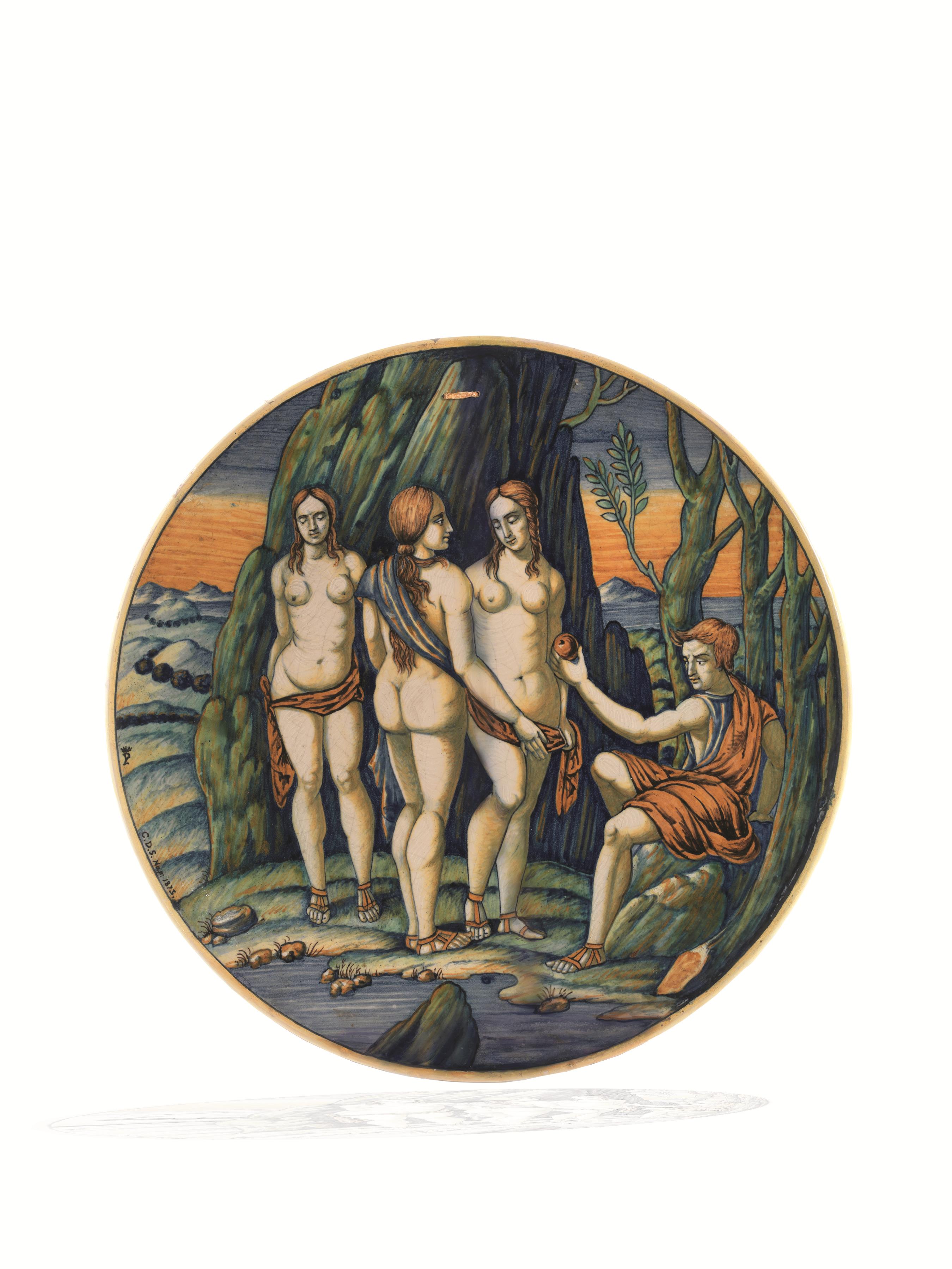 in maiolica dipinta in policromia, raffiguranti rispettivamente "Il giudizio di Paride" e "Scena mitologica", entrambi siglati C.D.S. e marcati con una P sormontata da corona, uno datato Nap:1873, diam. cm 50