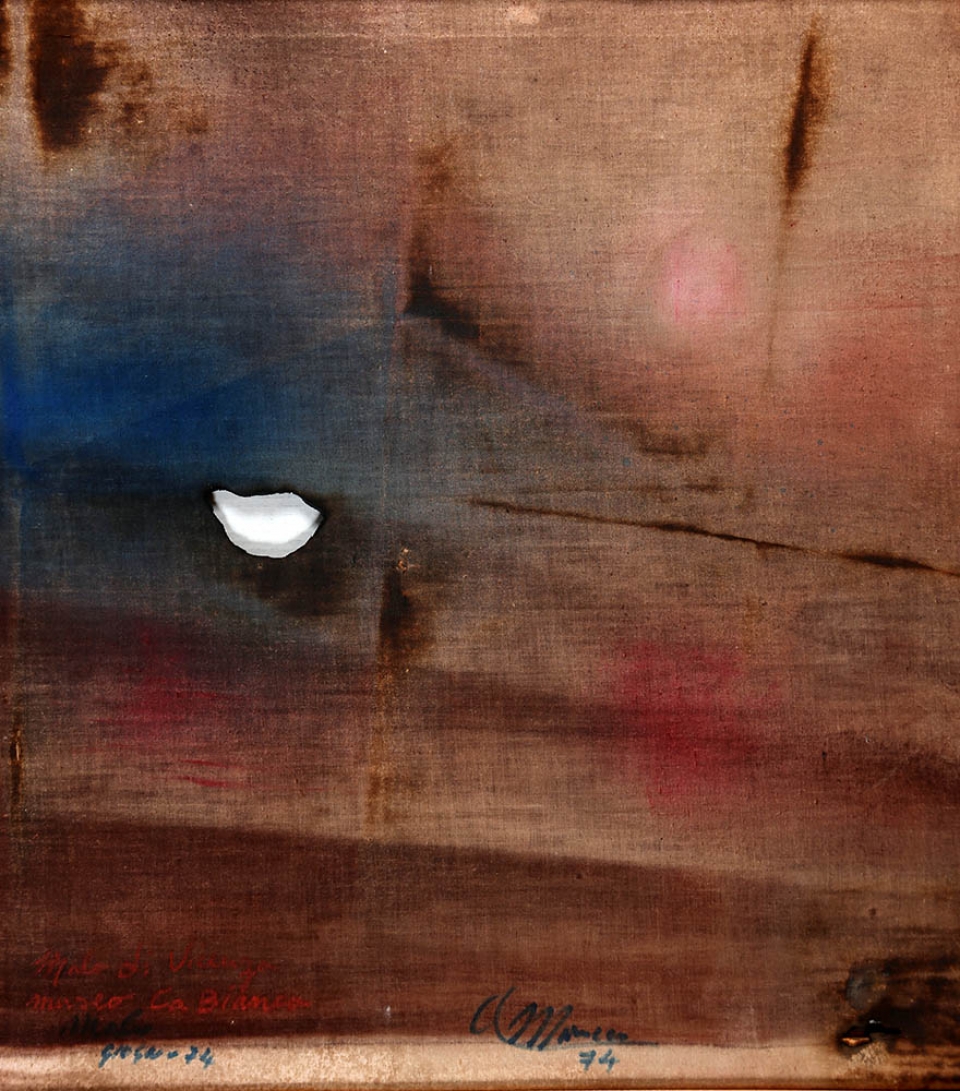 ARMANDO MARROCCO 1939 Senza titolo, 1974 Tela combusta (tela colorata per combustione di fumogeni), cm. 44,5 x 39 Firmato e datato in basso al centro Autentica dell'artista su fotografia Archivio Marrocco n. 1974/0190 Prov. Collezione Privata