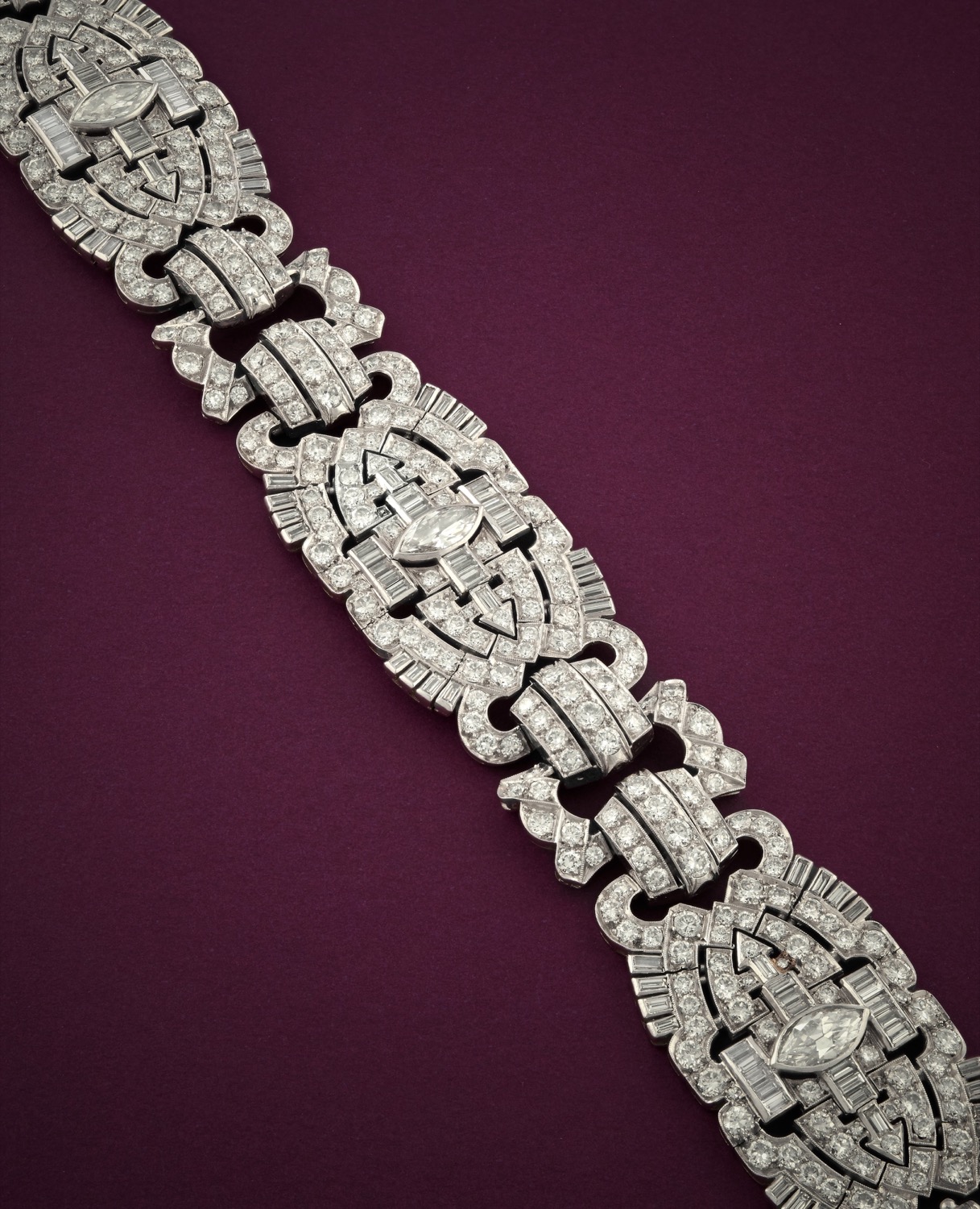 a settori snodati, interamente decorato da diamanti taglio marquise, brillante e baguette per complessivi ct 12,00 circa.