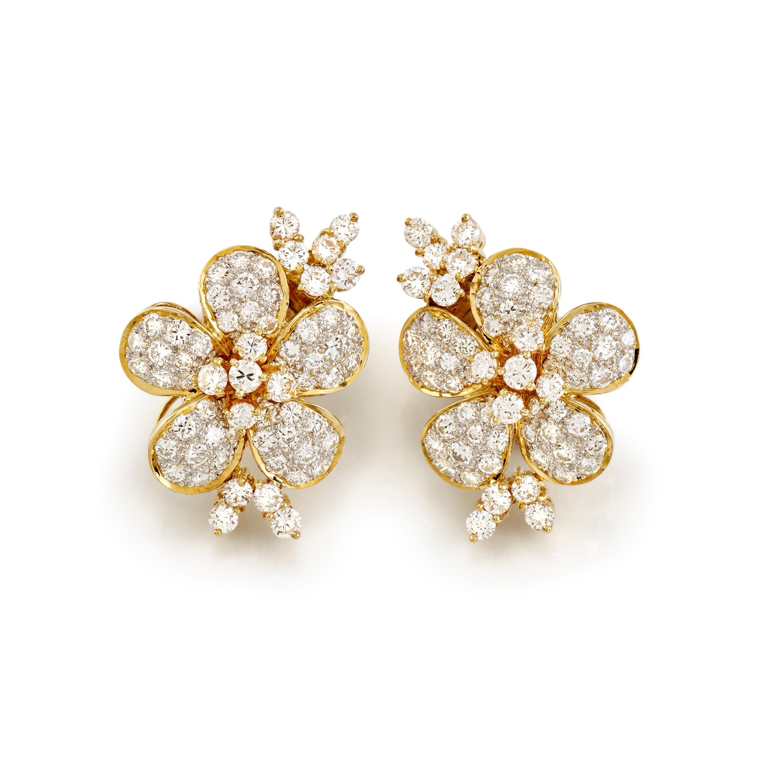 motivo a fiore, interamente decorati da diamanti taglio brillante per totale ct 4,00 circa, chiusura perno e farfalla con silicone.