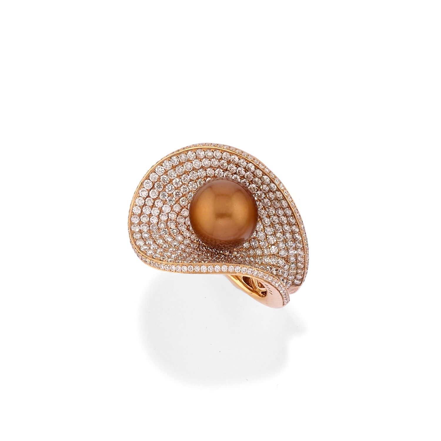 a forma di calla, al centro perla chocolate coltivata di mm 10,50-11,00 su pavé di diamanti taglio brillante.