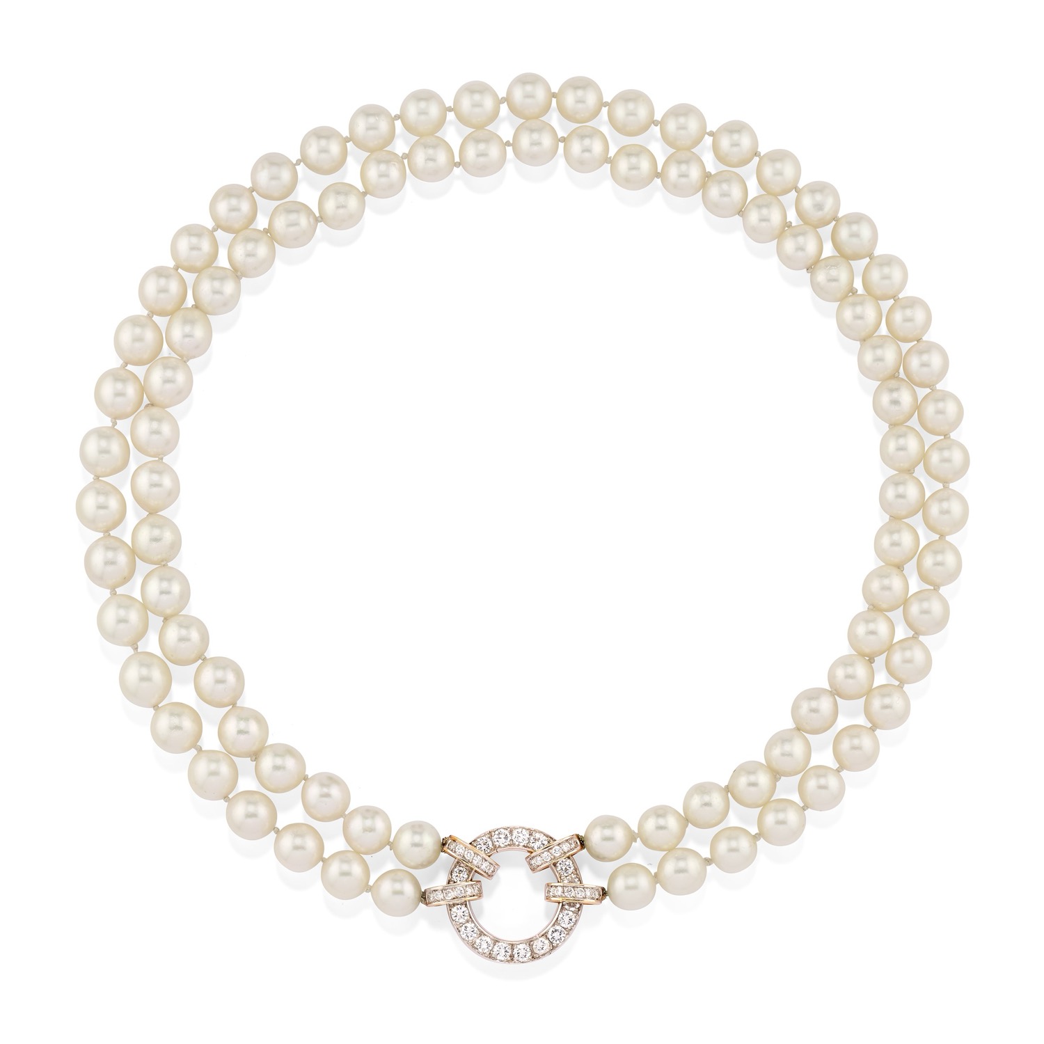 realizzata a due fili di perle coltivate di mm 9,00 circa, con chiusura ad anello decorato da diamanti taglio brillante per totale ct 2,00 circa.
