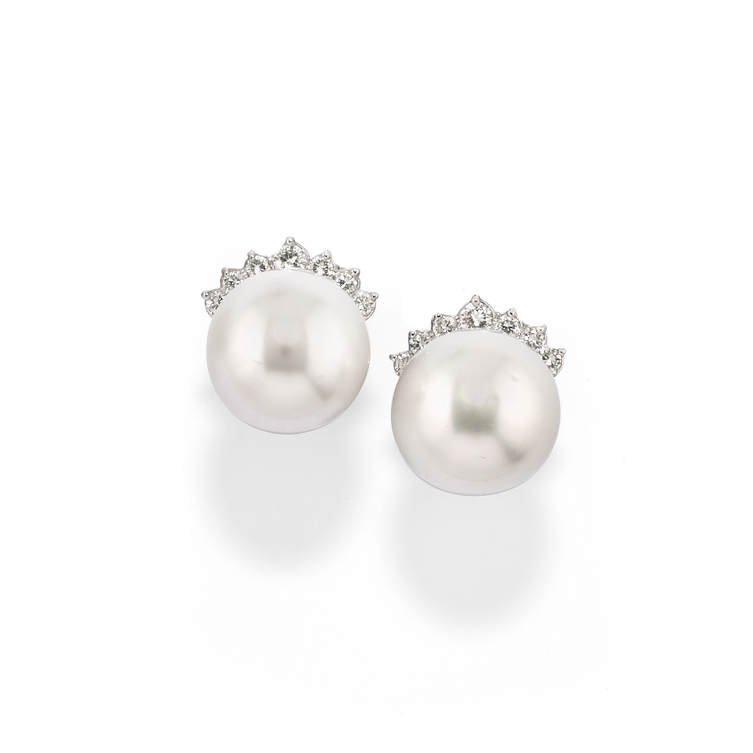con perle coltivate South Sea di mm 12,50 circa e motivo in diamanti taglio brillante per totale ct 0,40 circa, chiusura a perno e clip.
