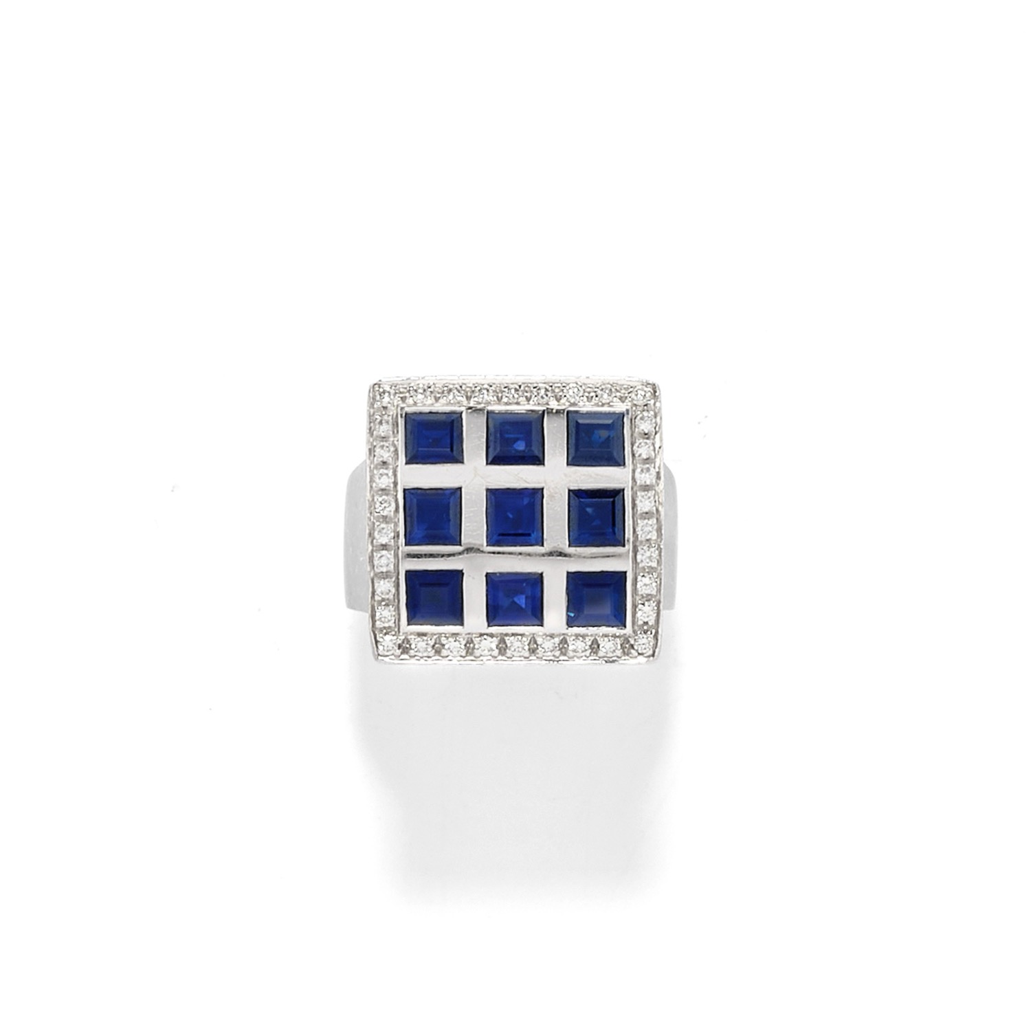 di forma quadrata, griglia con zaffiri taglio carrè per totale ct 3,30 circa e contorno in diamanti taglio brillante per totale ct 0,60 circa.