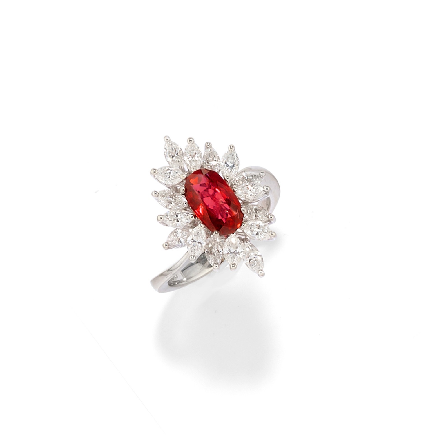 al centro rubino taglio ovale di ct 2,00 circa entro contorno in diamanti taglio marquise per totale ct 1,60 circa.