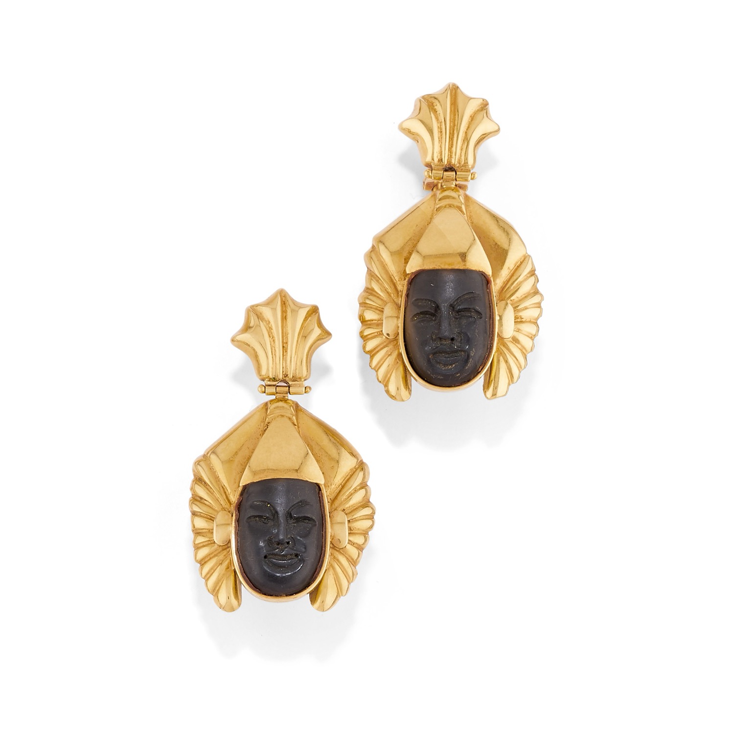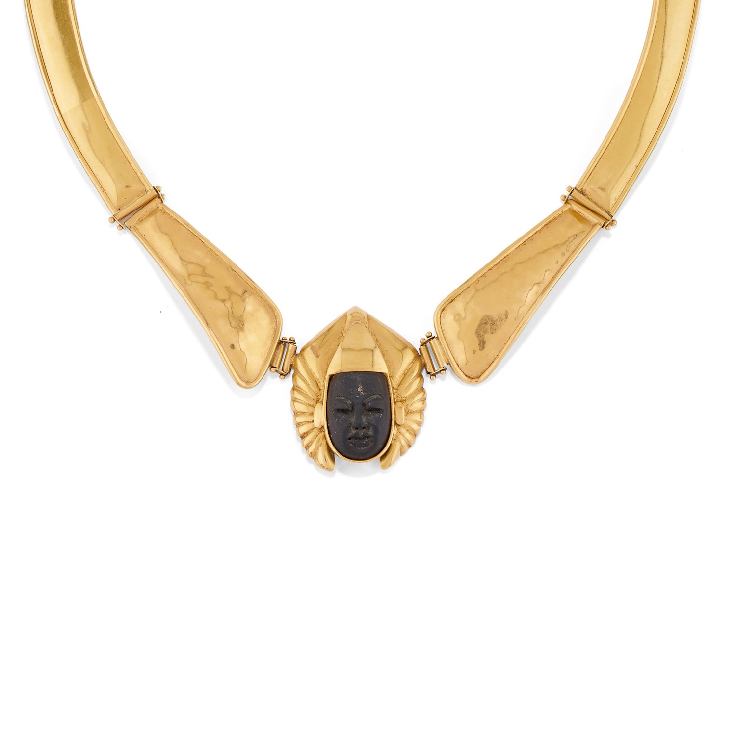 con inserti in legno incisi a volto, composta da collana e coppia di orecchini con chiusura perno e clip.