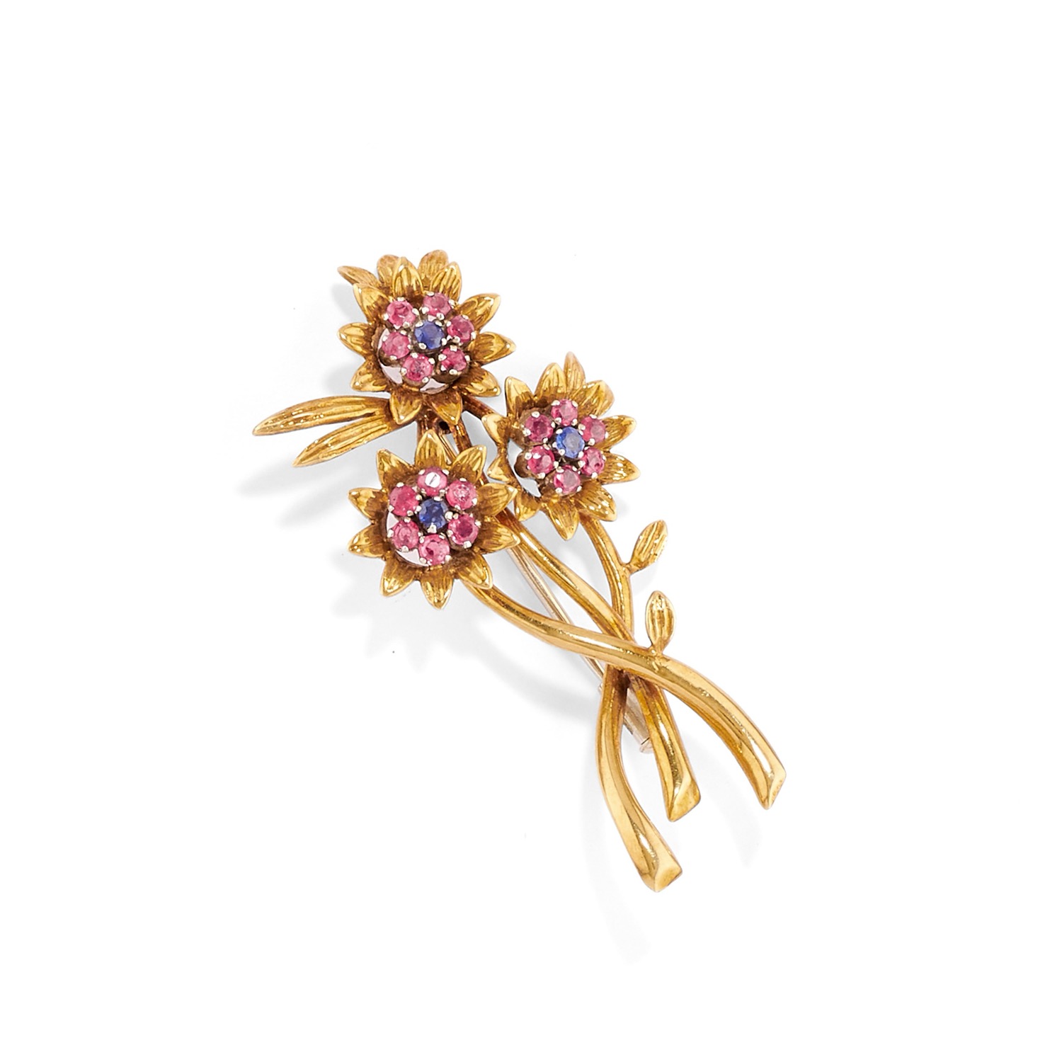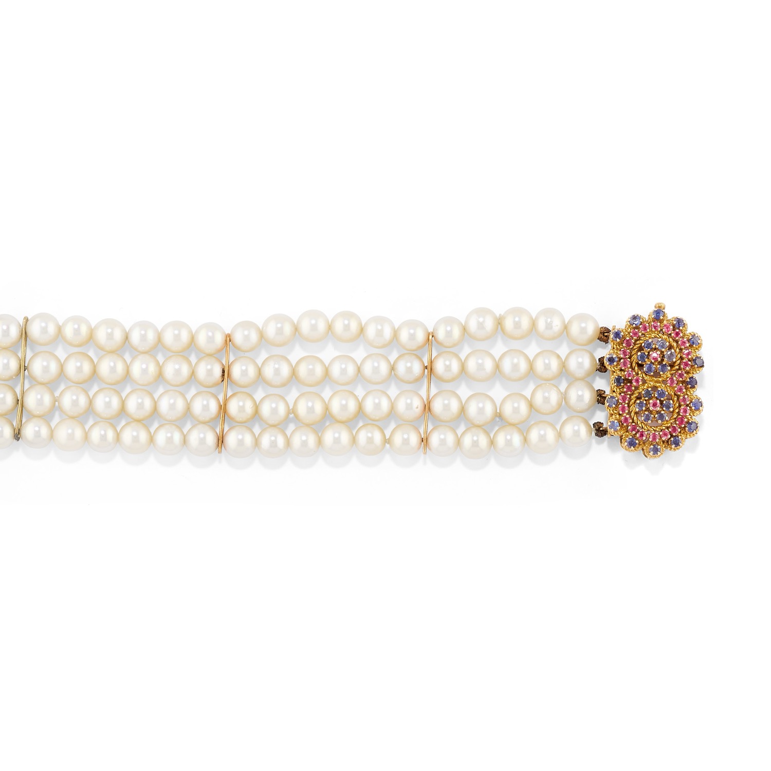composto da bracciale a quattro fili di perle coltivate di mm 6,00/6,50 circa, chiusura con zaffiri e rubini taglio rotondo e spilla con fiori decorati da rubini e zaffiri taglio rotondo.