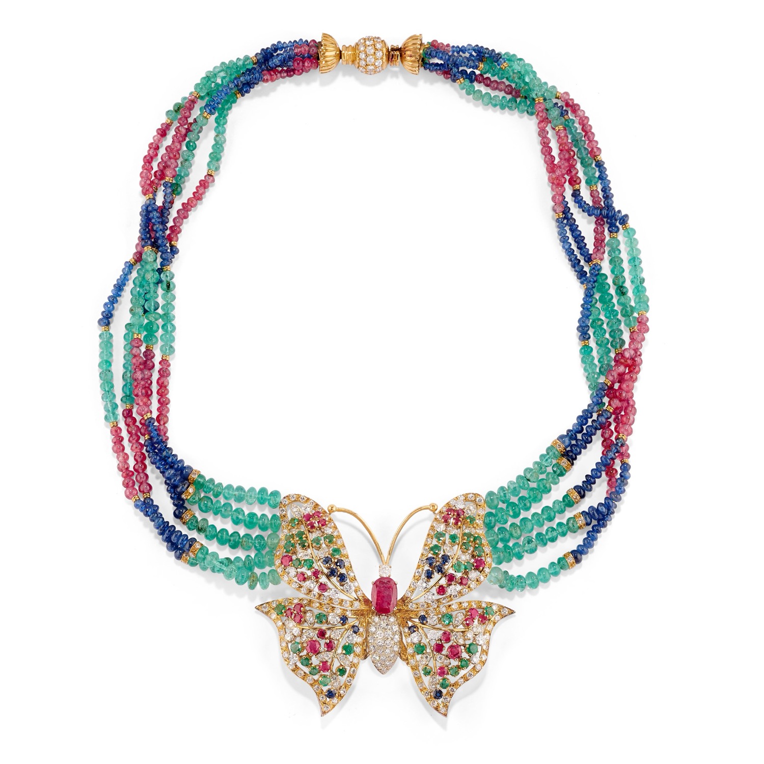 a cinque fili di rubini, zaffiri e smeraldi intervallati a interruttori in oro e diamanti, al centro farfalla in zaffiri, rubini e smeraldi taglio rotondo, diamanti taglio brillante e huit-huit.