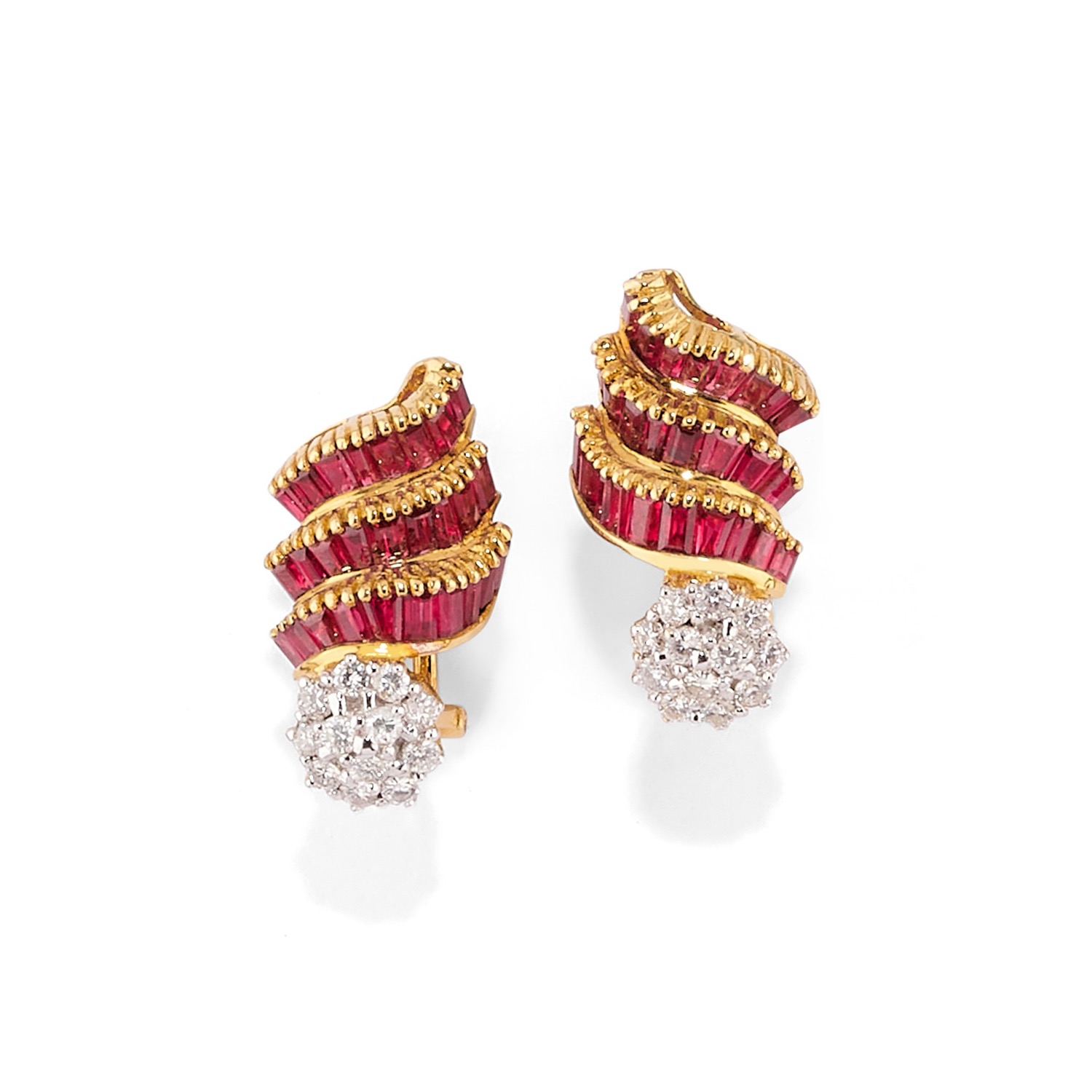 nastri in rubini taglio baguette per totale ct 1,50 circa, fiori in diamanti taglio brillante per totale ct 0,80 circa, chiusura perno e clip.