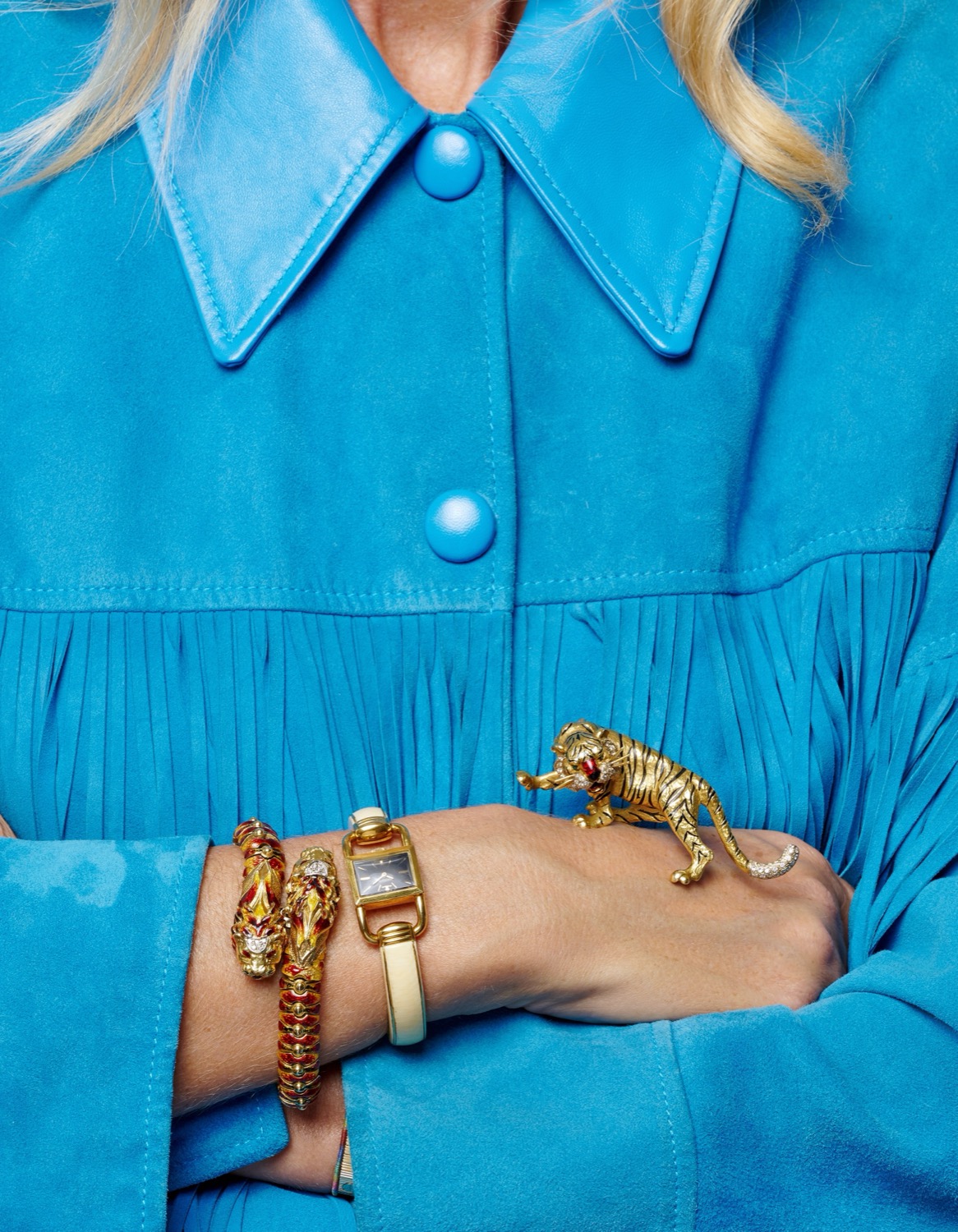 a maglia morbida in smalto policromo, terminali in teste di tigri a contrarié, piccoli diamanti a decoro.