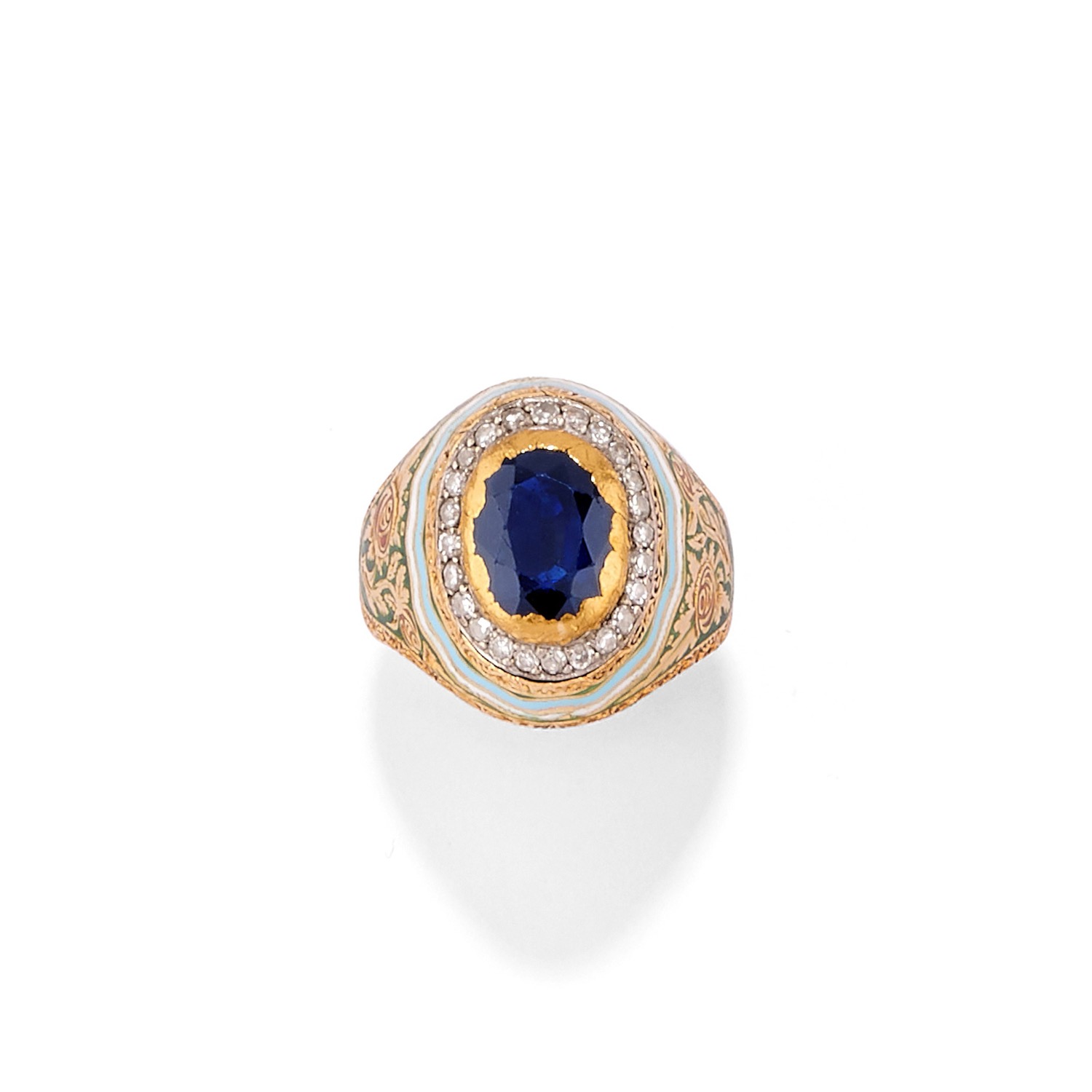 cesellato con decori floreali in smalto policromo, al centro zaffiro taglio ovale e contorno in diamanti taglio huit-huit.