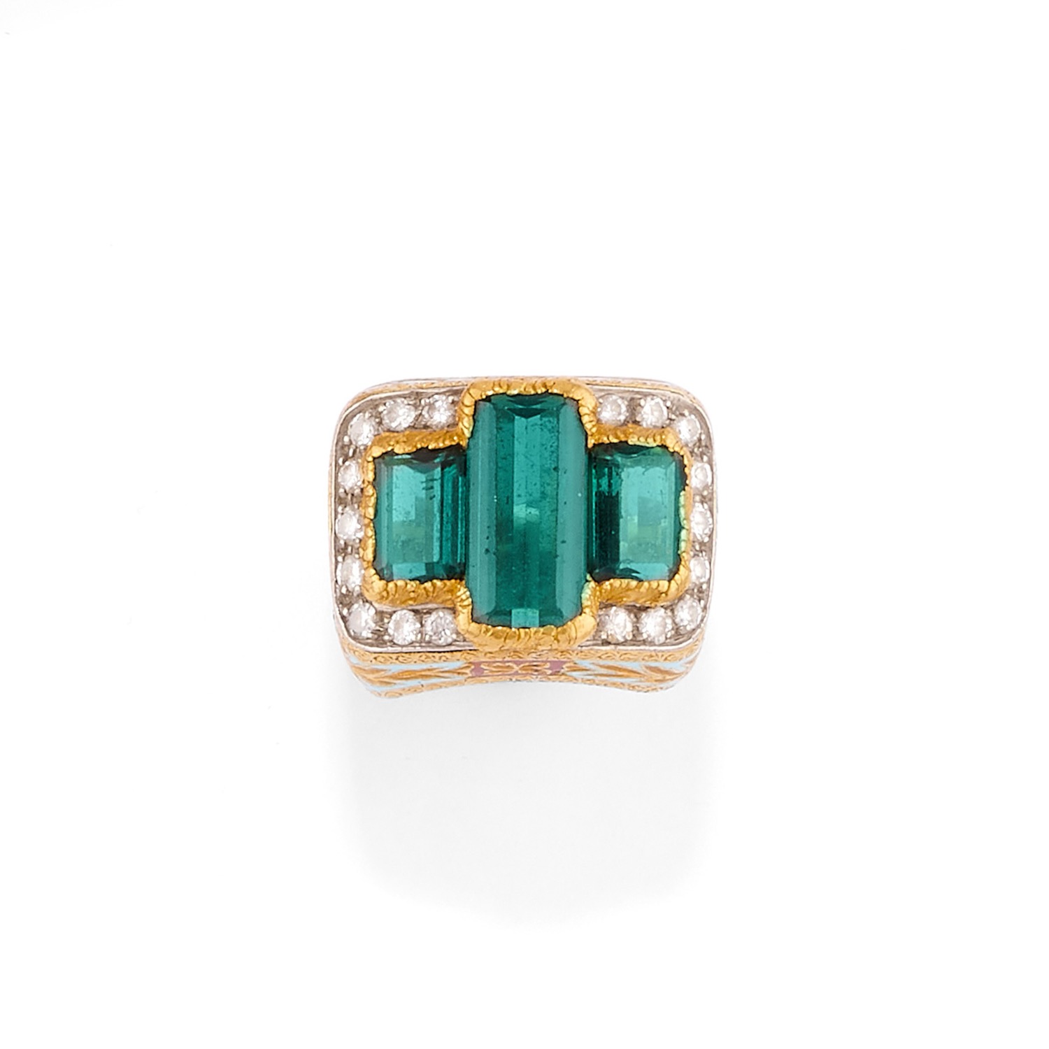 decoro floreale in smalto policromo, al centro tre tormaline verdi taglio rettangolare a contorno ottagonale entro giro di diamanti taglio brillante, con scatola.