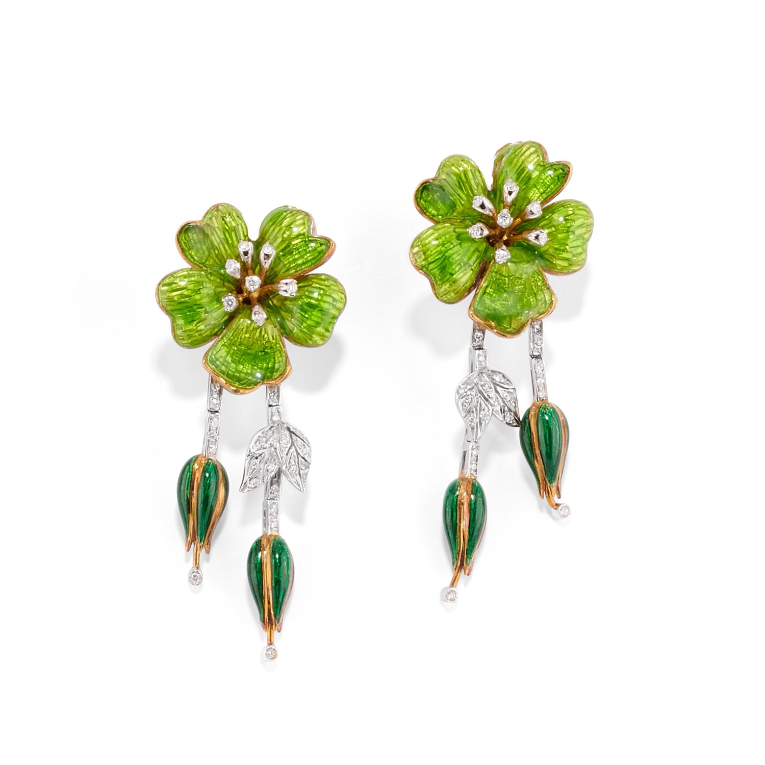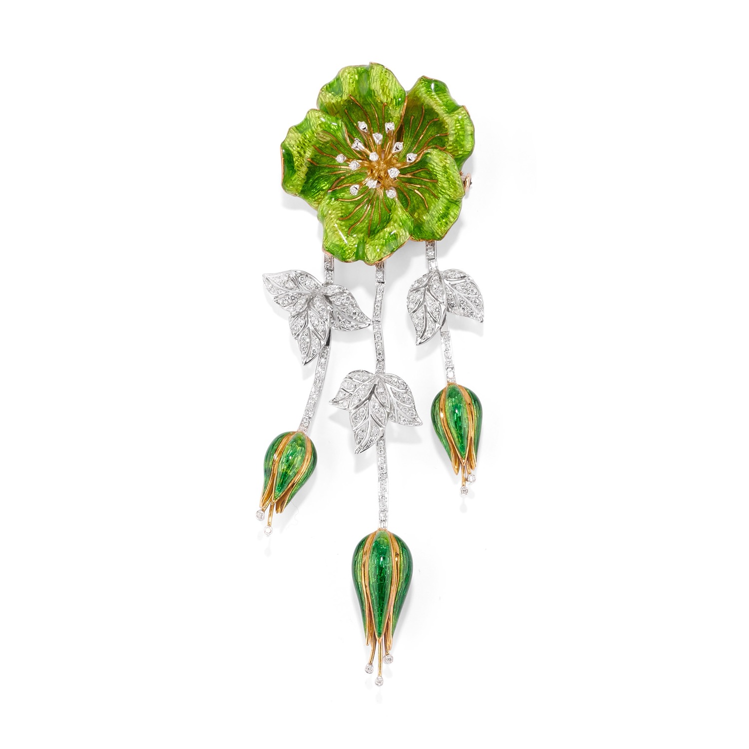 in smalto verde e diamanti taglio brillante per totale ct 2,00 circa, composta da spilla e coppia di orecchini con chiusura a clip.
