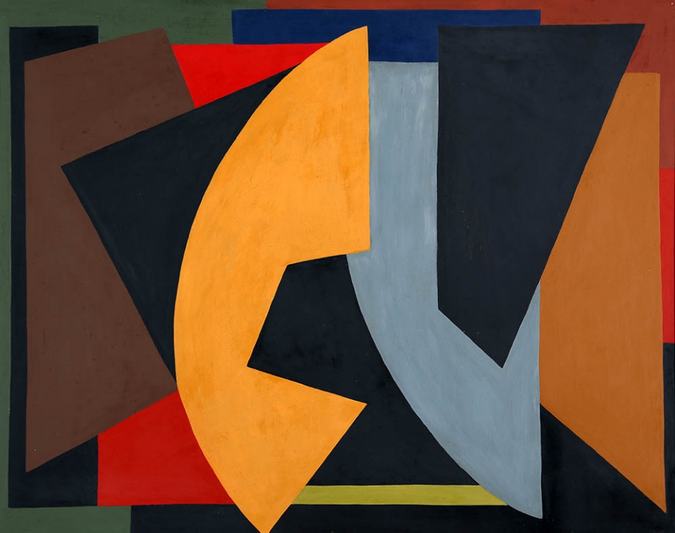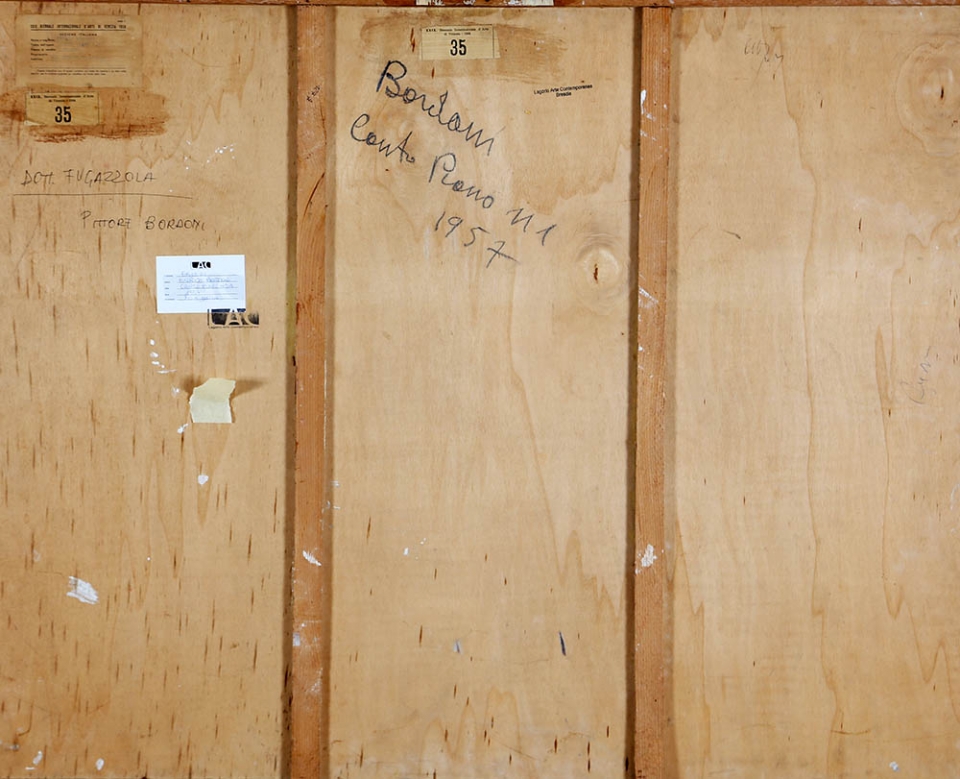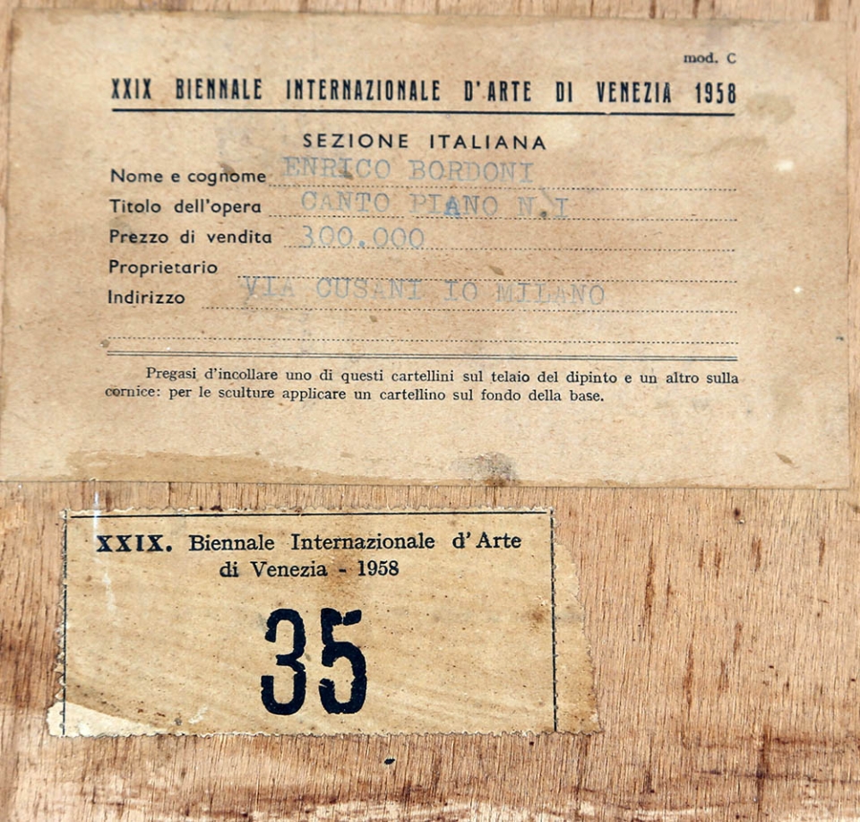 ENRICO BORDONI 1904 - 1969 " Canto Piano n. 1 ", 1957 Olio su tavola, cm. 80 x 100 Firmato e datato sul retro Etichetta XXIX Biennale di Venezia sul retro Etichetta Galleria Lagorio Arte Brescia sul retro Prov. Collezione Privata