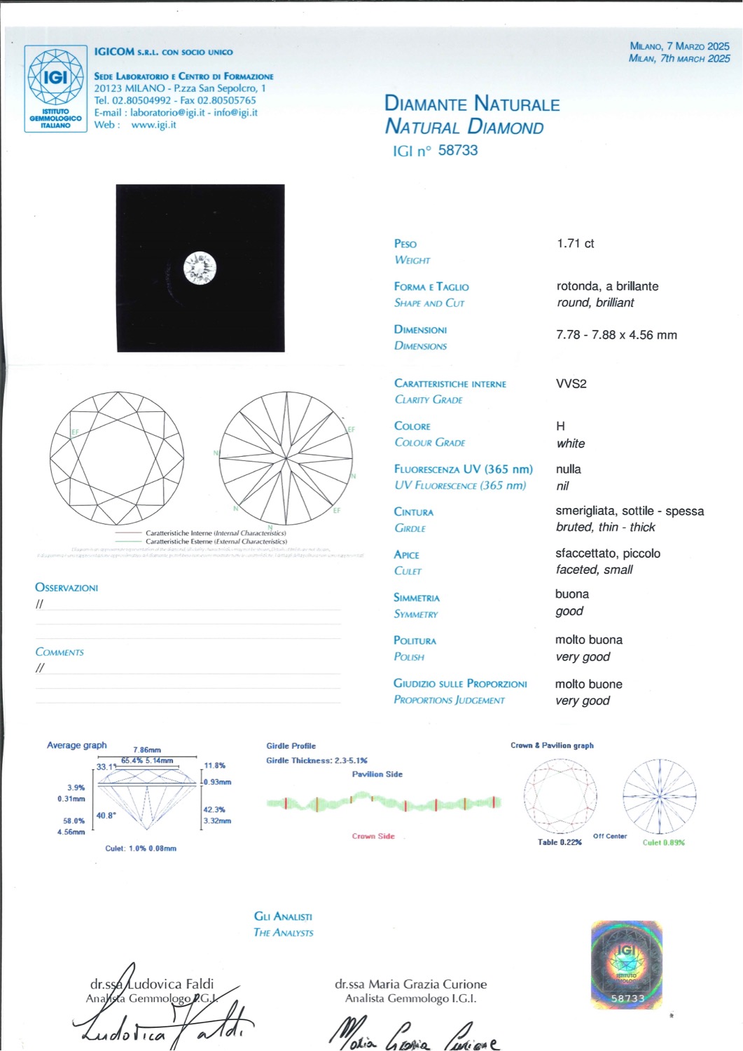 diamante taglio brillante di ct 1,71, colore H, purezza VVS2.