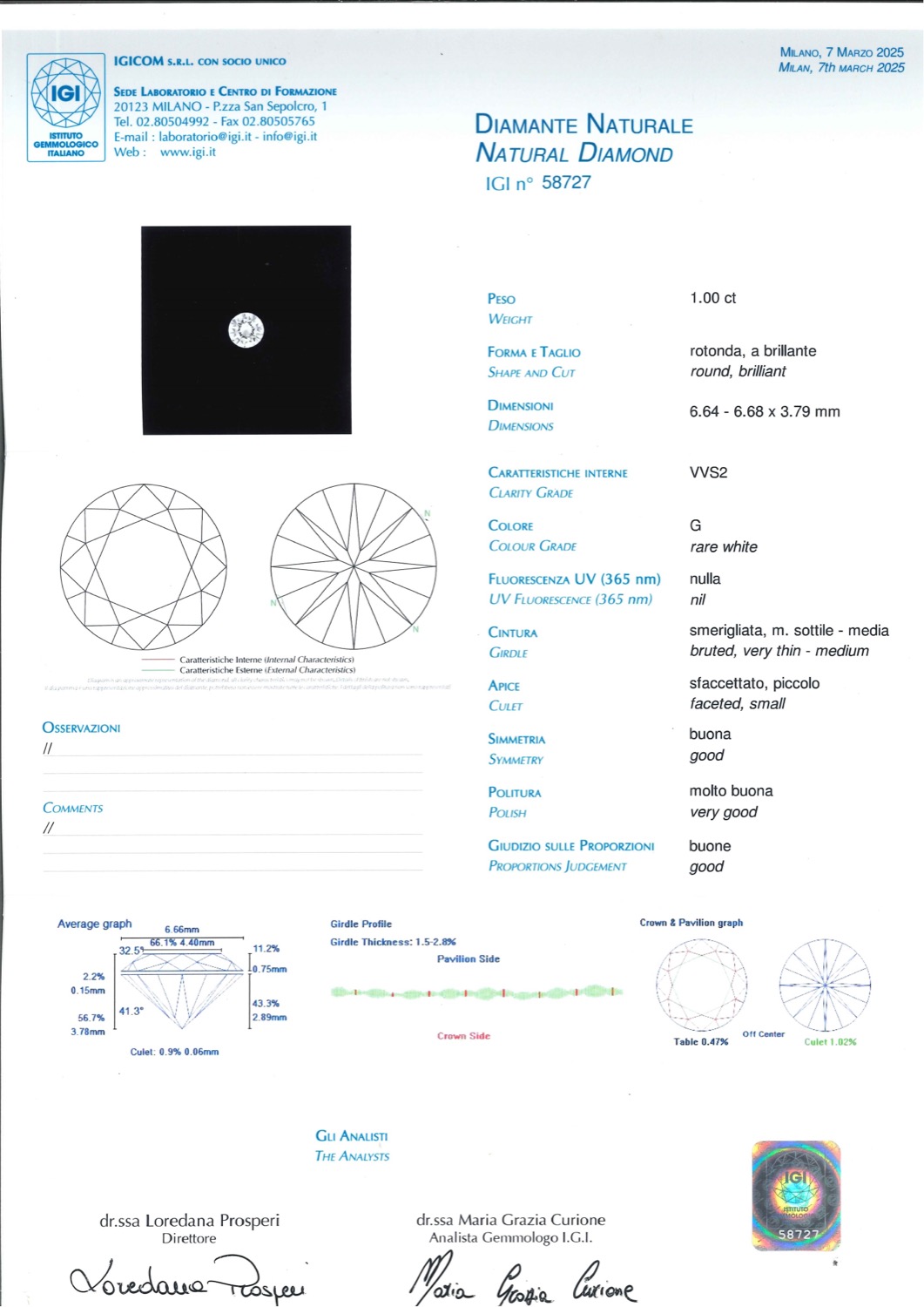 Il diamante è accompagnato da certificato gemmologico n. 58727 del 07/03/2025, IGI, Milano.