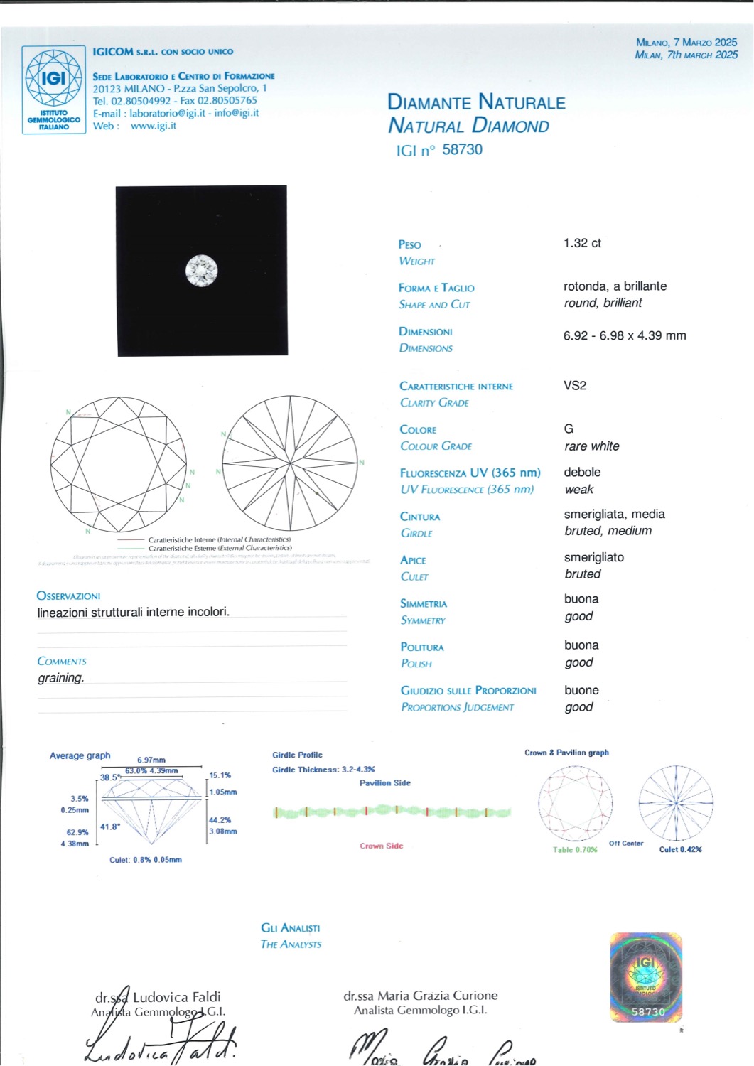 Il diamante è accompagnato da certificato gemmologico n. 58730 del 07/03/2025 IGI, Milano.