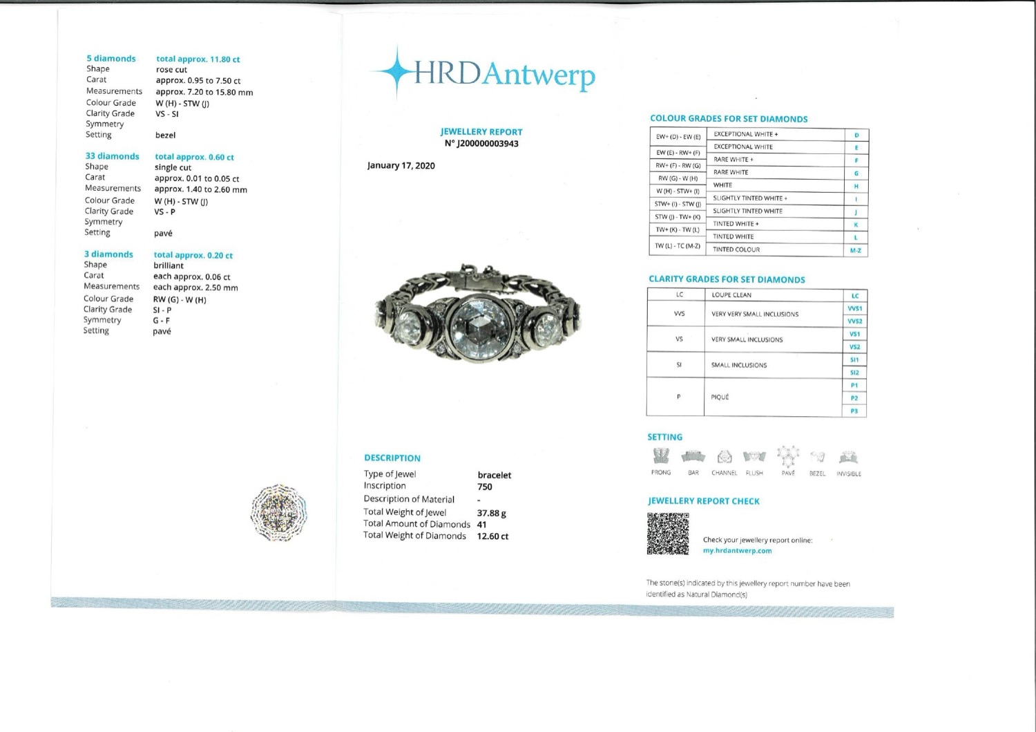 Il bracciale è accompagnato da certificato gemmologico n. J200000003943 del 17/01/2020, HRD Antwerp.