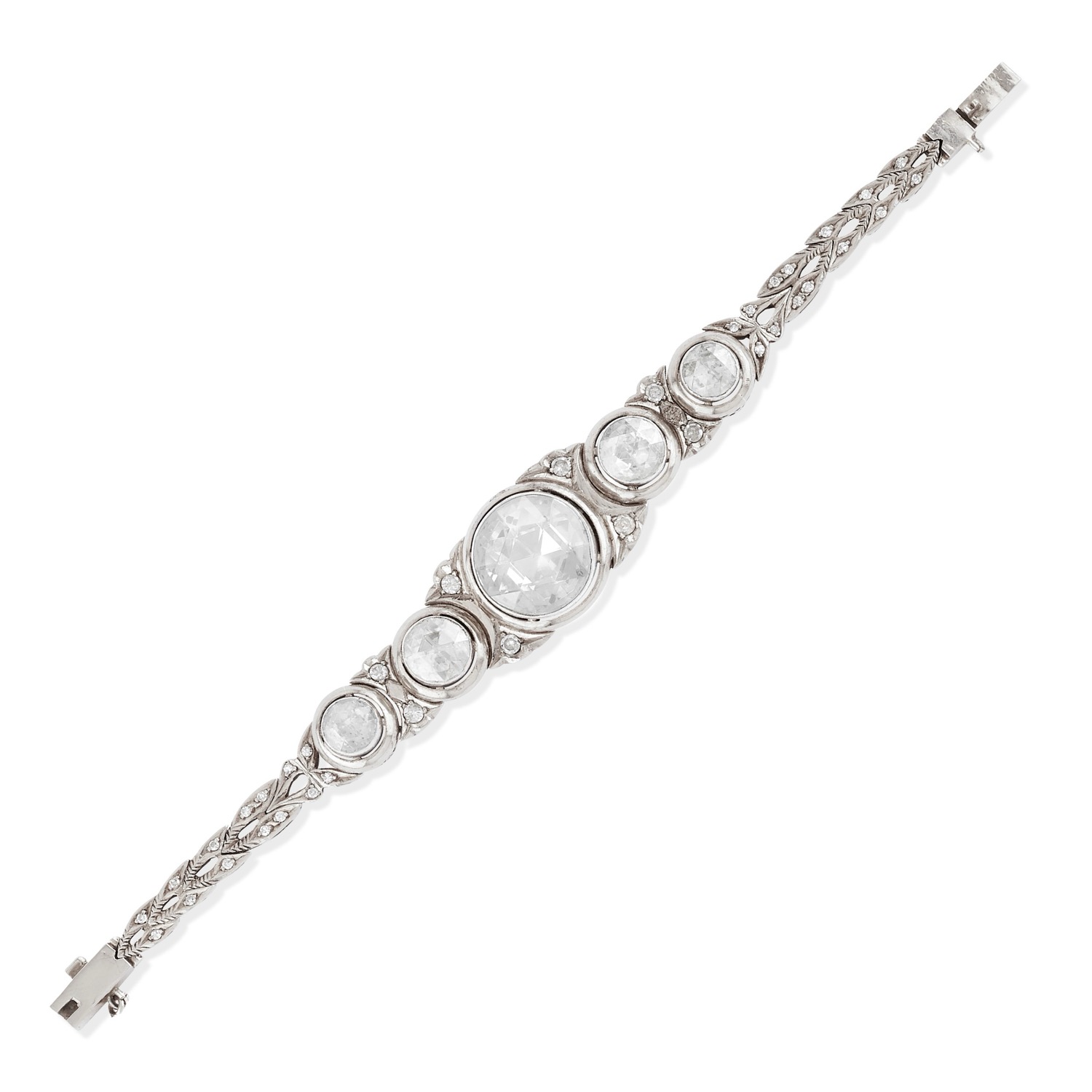 realizzato con cinque diamanti taglio rosa per totale ct 11,80 circa (da ct 0,95 a 7,50 circa), colore H-J, purezza VS-SI, trentatré diamanti single cut per totale ct 0,60 circa, colore H-J, purezza VS-P, tre diamanti taglio brillante per totale ct 0,20 circa, colore G-H, purezza SI-P.