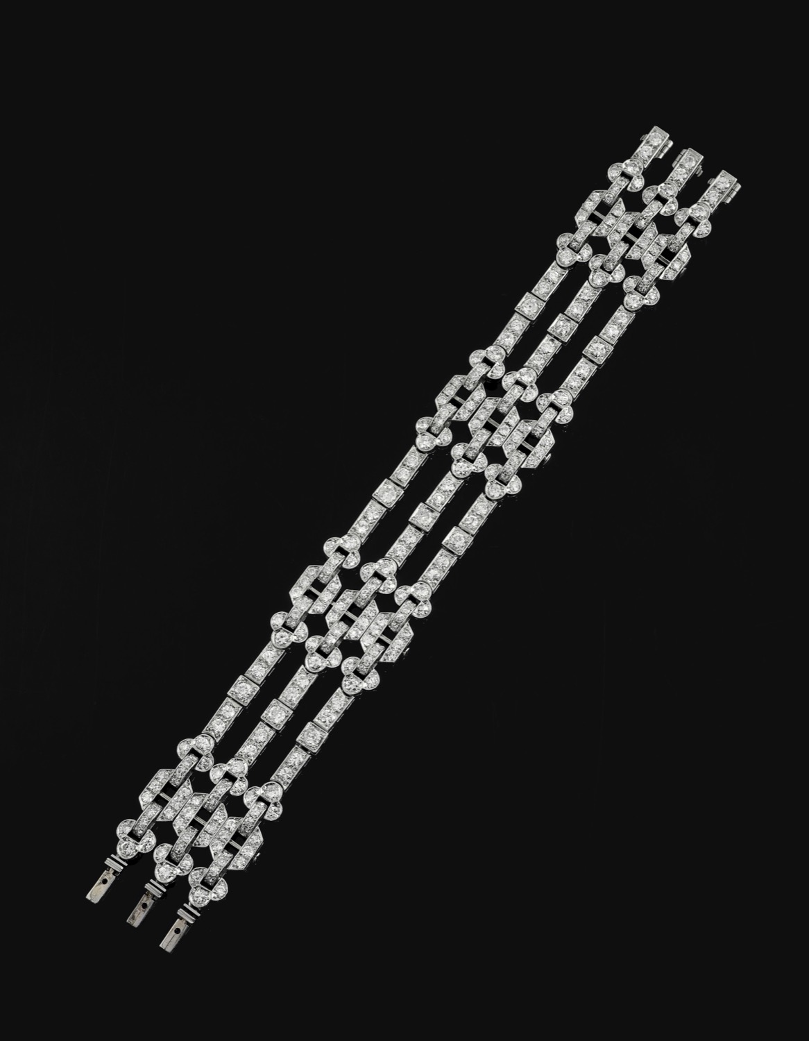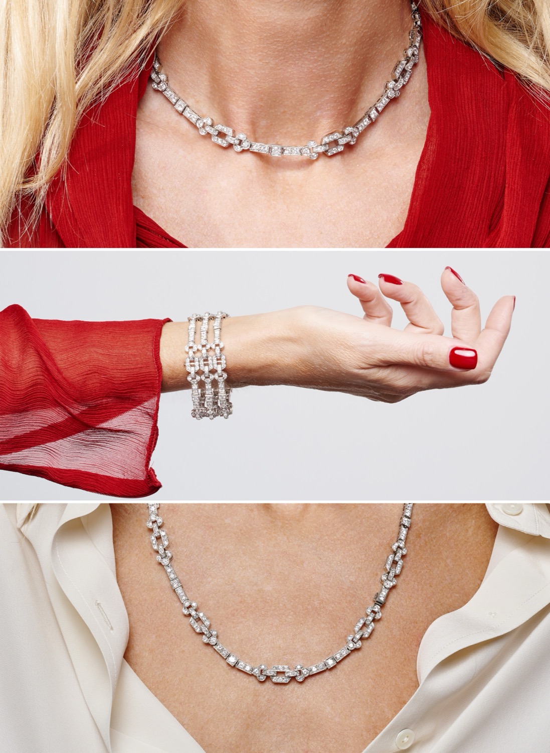 lavorazione a milligrano, diamanti taglio brillante, vecchio e huit-huit per totale ct 12,00 circa, indossabile come collana lunga, tre bracciali o girocollo.