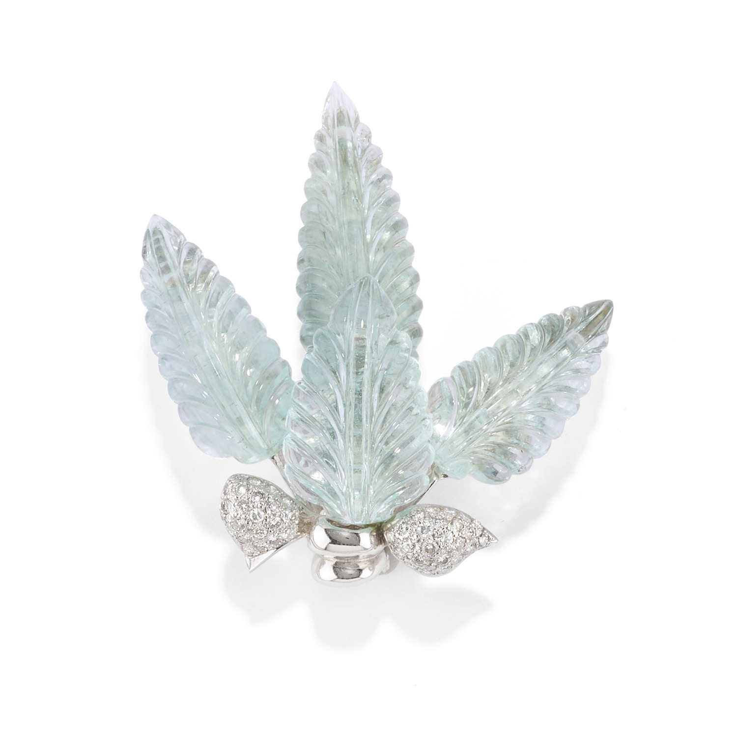 realizzata con quattro foglie in acquemarine incise a foglia, fiocco con diamanti taglio brillante.