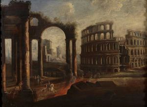 PITTORE ANONIMO FINE XVII SECOLO Capriccio architettonico Olio su tela...