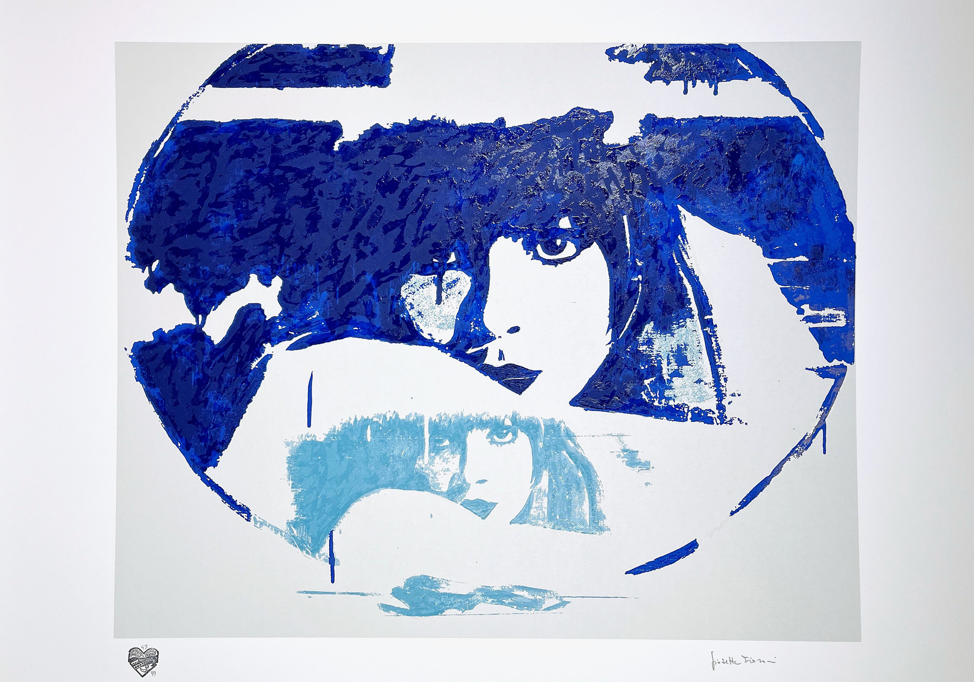 FIORONI GIOSETTA Roma 1932 "Doppio liberty blue" Serigrafia polimaterica e carborundum a colori su carta Hahnemuhle 400 gr. cm 70x100. Firmata sul fronte in basso a destra, a sinistra tiratura e timbro dell'Archivio Parise Fioroni.