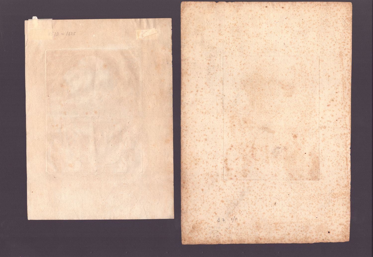 Il primo stato stampato su una porzione di carta vergata priva di filigrana. Foglio con ampi margini, in buono stato di conservazione salvo fioriture sparse. Il secondo stato stampato su carta vergata con un frammento di filigrana. Foglio con ampi margini, in ottimo stato di conservazione salvo due macchie da nastro cartaceo sul margine superiore e lievissime bruniture.