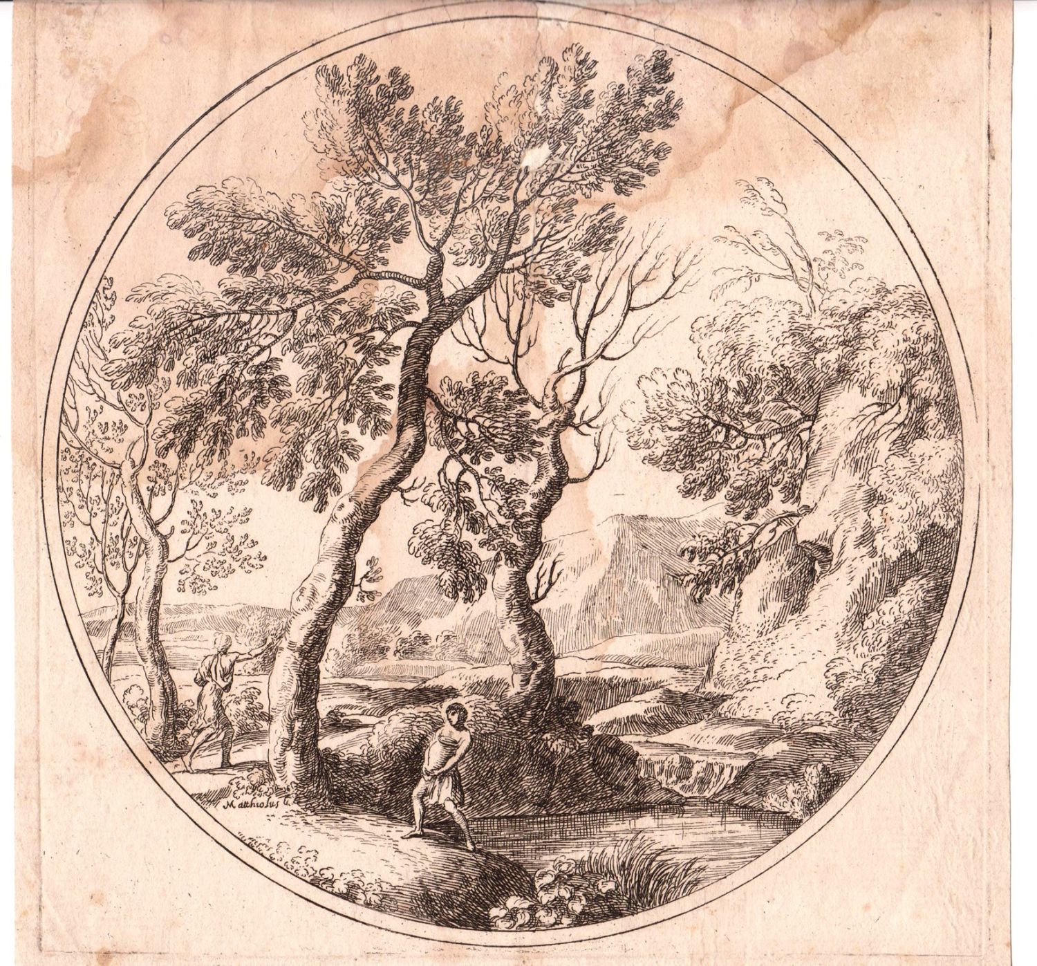 Molto belle impressioni su carta vergata, due esemplari su porzioni di carta con filigrana. Esemplari rifilati, ma in generale in ottimo stato di conservazione, salvo qualche macchia. Paesaggio con due figure in piedi con piccoli margini preservati, ma presenta una mancanza ricomposta nella parte alta e traccia di piega verticale centrale.