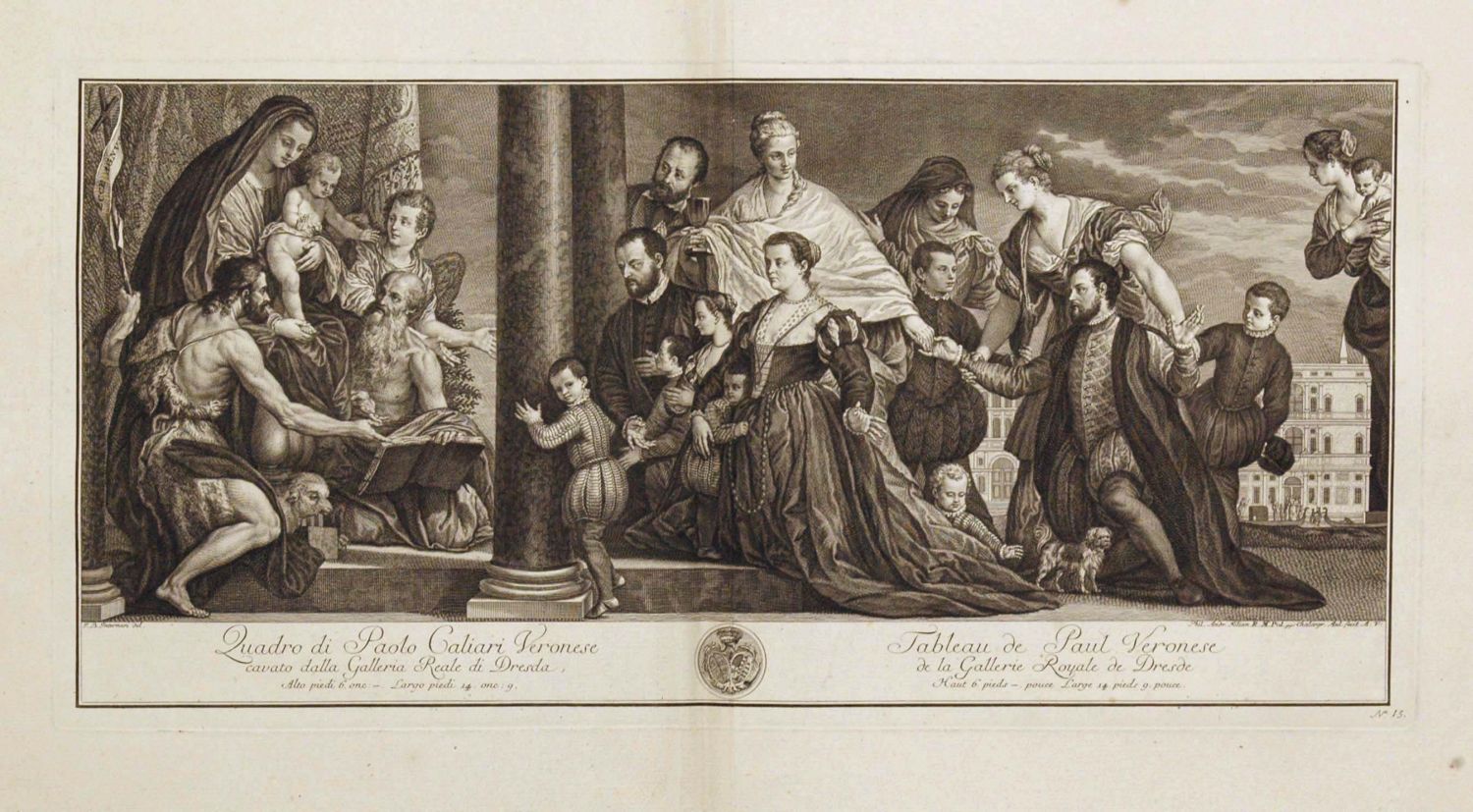 Bulino e acquaforte, 278 x 578 mm (lastra), 760 x 1000 mm ca. (foglio). Tavola dalla raccolta "Recueil d'estampes d'après les plus célèbres tableaux de la Galerie Royale de Dresde".