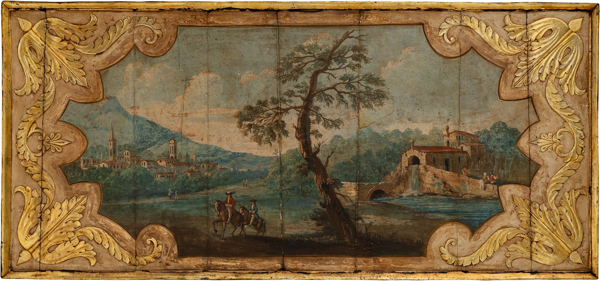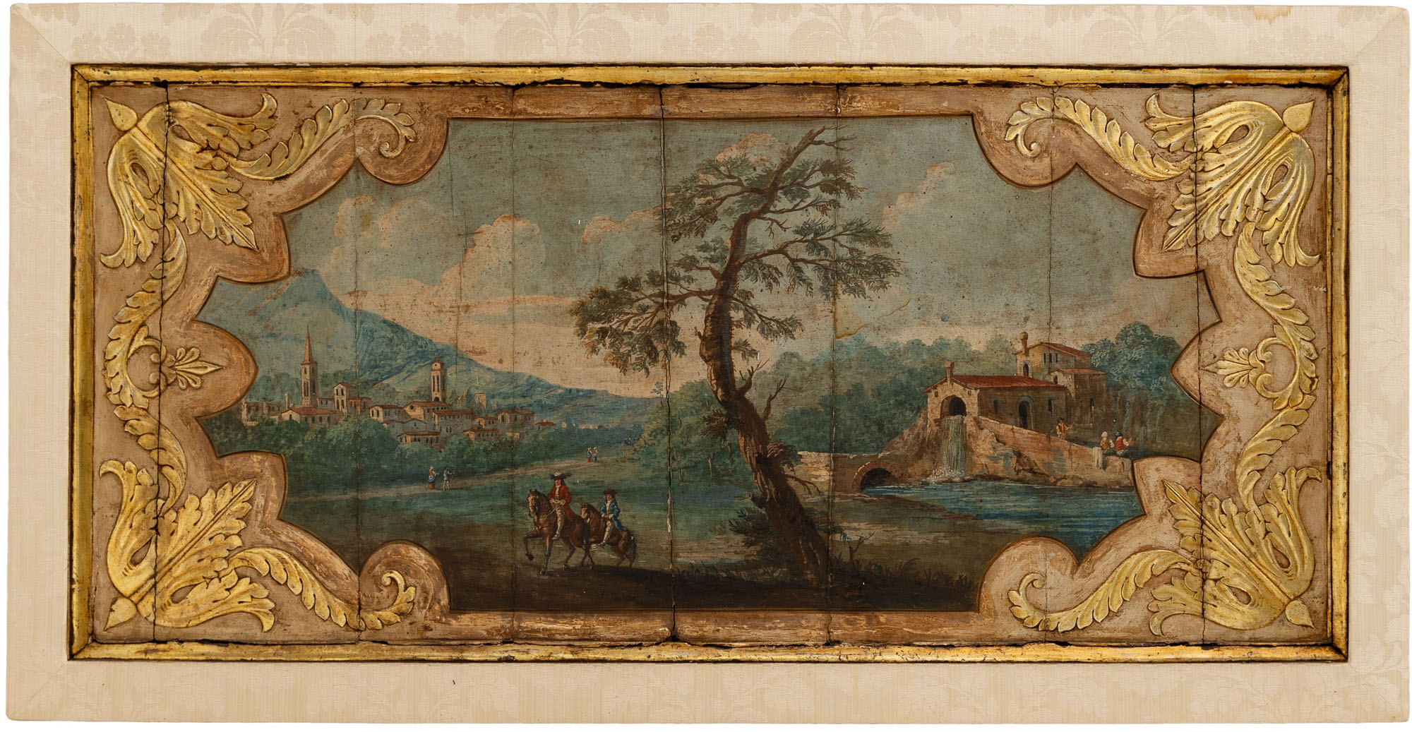 Scuola francese del secolo XIX / XX - Paesaggio in stile settecentescoOlio su tavola72,5 x 154,5 cm