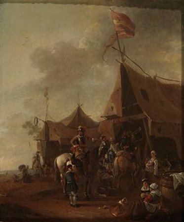 PITTORE ANONIMO FIAMMINGO SECOLO XVII Accampamento Olio su tavola 56x45 cm...
