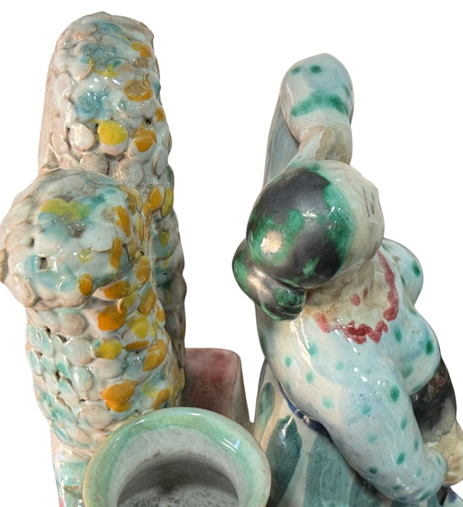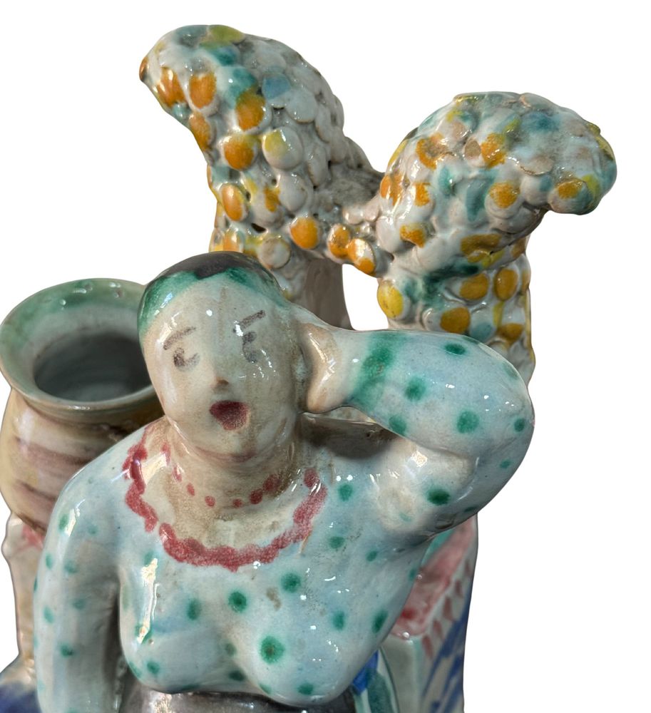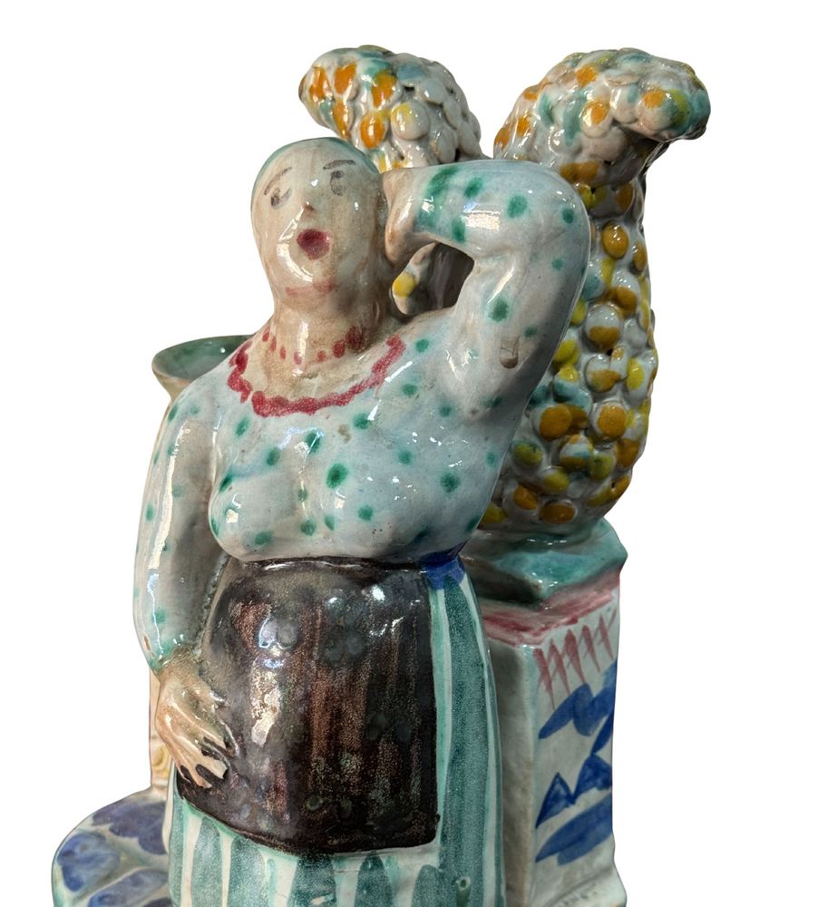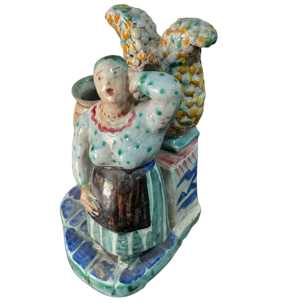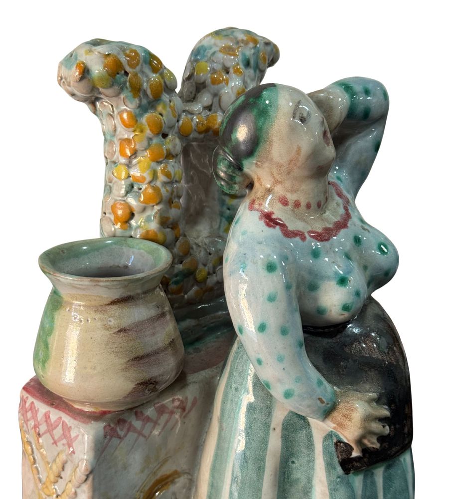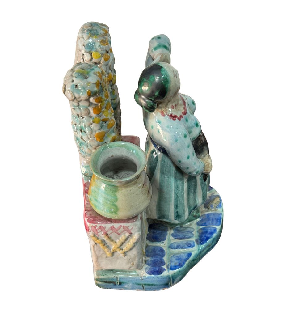 Statuetta in ceramica smaltata, periodo XX secolo, raffigurante Donna al pozzo. Fabbricazione Di Val. Dimensioni: h27x16x16 cm. Opera in buone condizioni.
