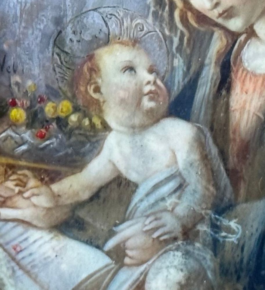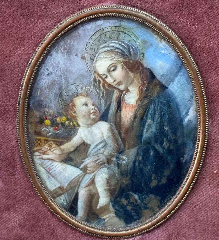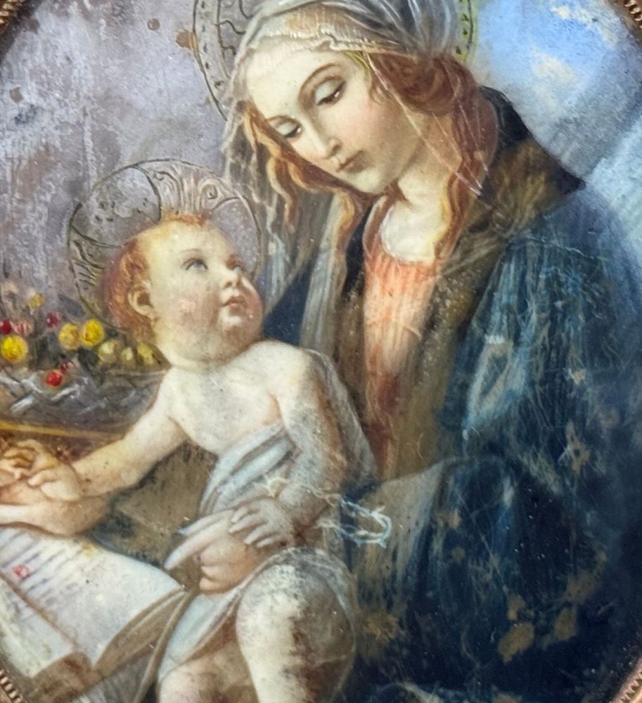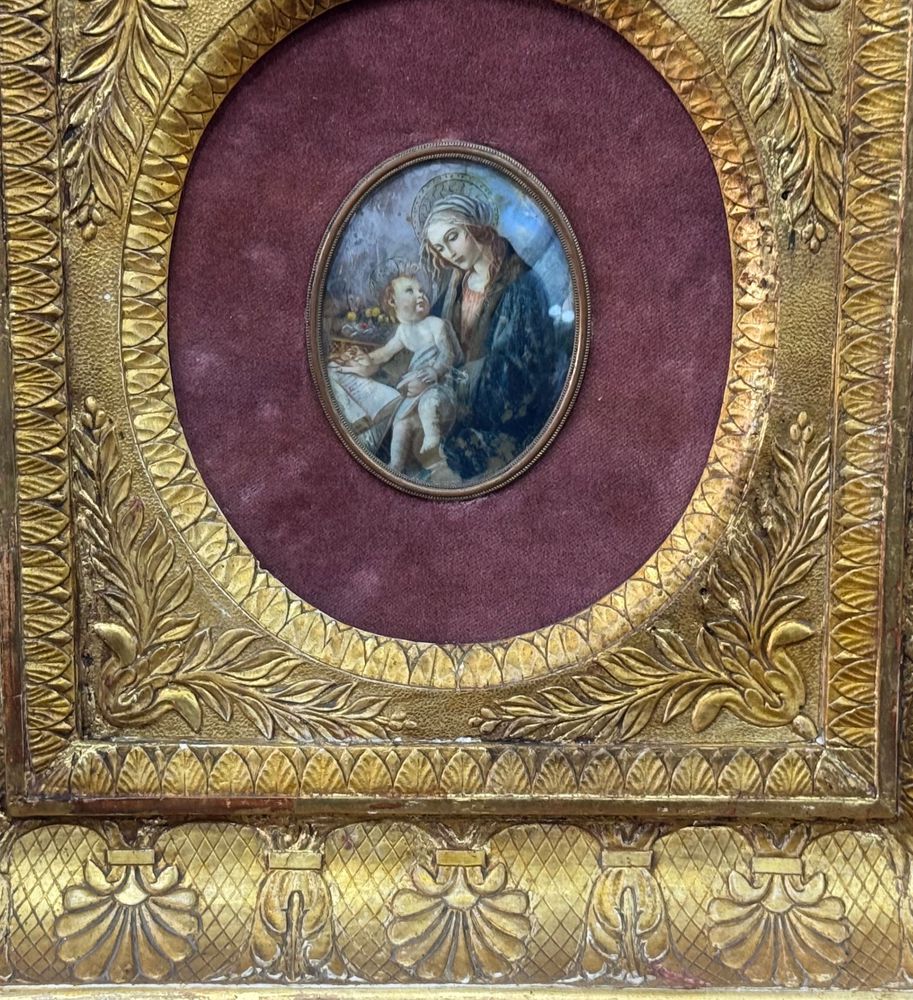Dipinto miniatura su placca, periodo XIX secolo scuola Italiana, raffigurante Vergine Bambino da Botticelli. Dimensioni compreso cornice: 33x35 cm. Dimensioni interno cornice: 10x7 cm. Opera in buone condizioni con lievi segni di vissuto come da foto allegate. Cornice periodo impero.