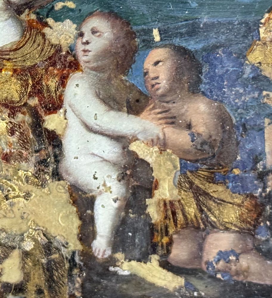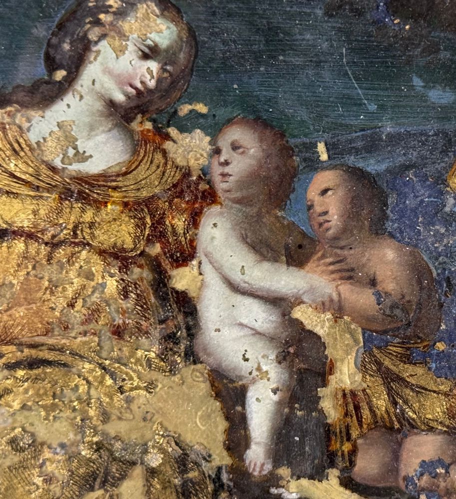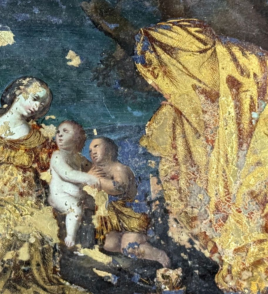 Dipinto sottovetro, periodo XVII secolo scuola italiana raffigurante Vergine Maria, Gesù e San Giovannino. Dimensioni compreso cornice: 36x30 cm. Dimensioni interno cornice: 29x23,5 cm. Artista anonimo. Opera in discrete condizioni come da foto allegate