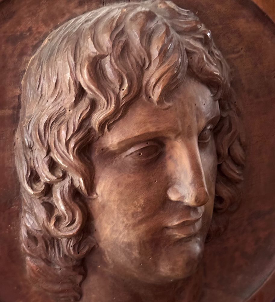 Scultura in legno a basso rilievo, raffigurante Volto maschile, periodo XIX...
