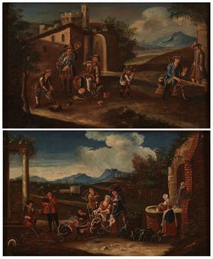 PITTORE ANONIMO DEL XVII SECOLO Coppia di dipinti raffiguranti scene di vita...