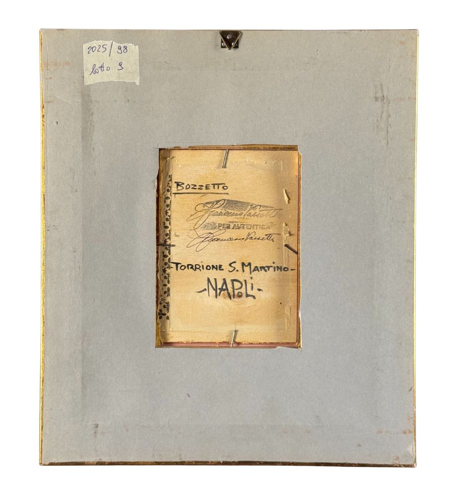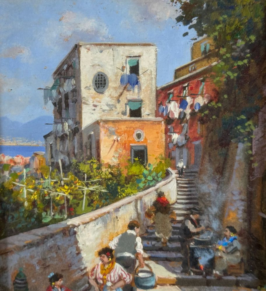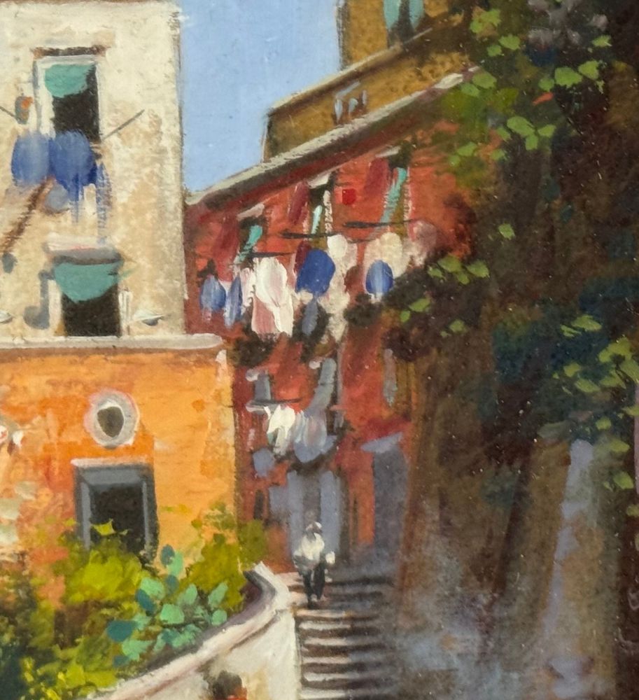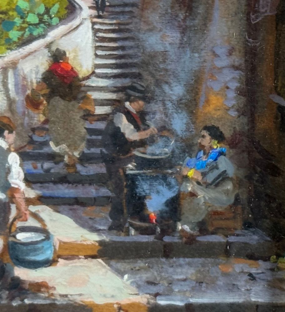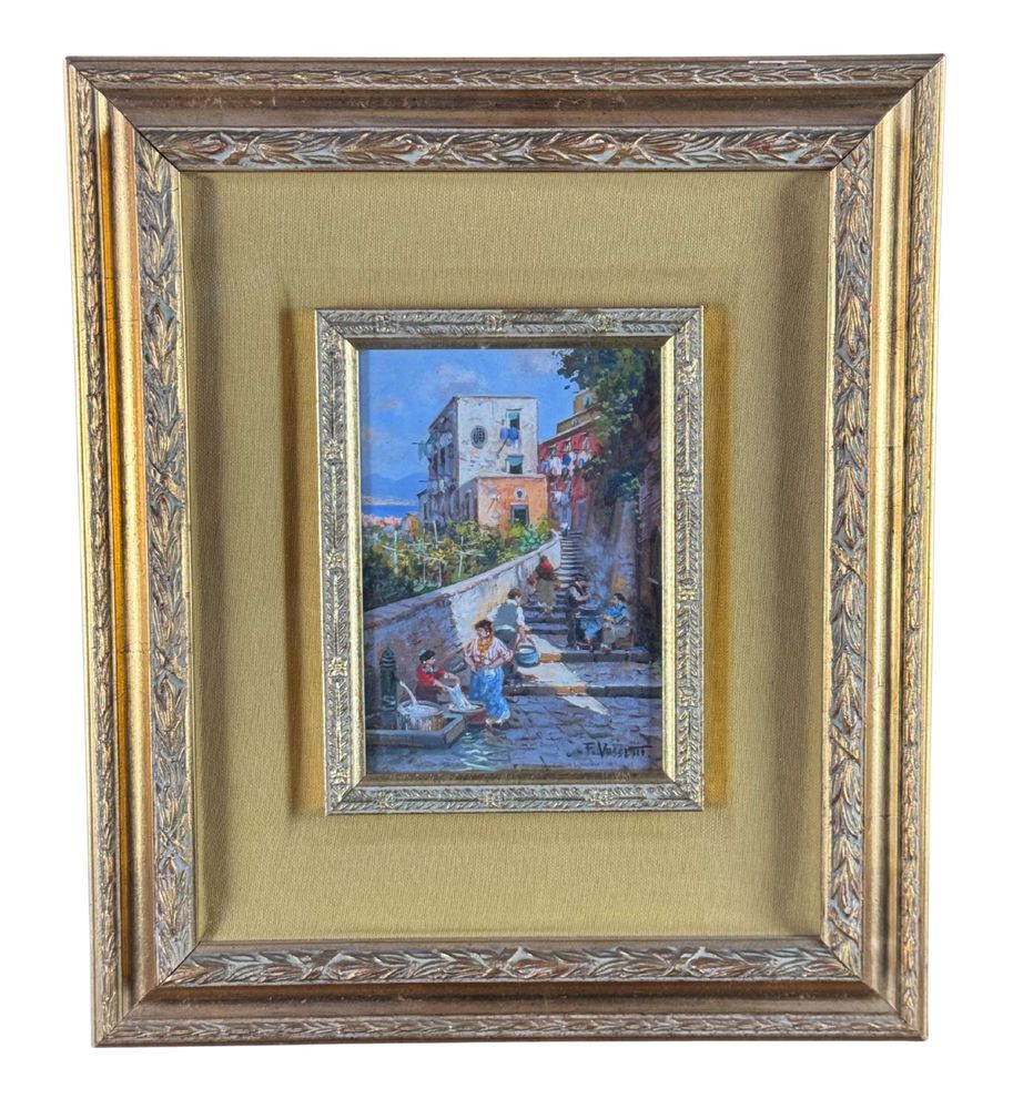 Dipinto olio su tavola, periodo XX secolo, scuola Italiana, raffigurante Stradina con scale e personaggi. Dimensioni compreso cornice: 34x40 cm. Dimensioni interno cornice: 13x18 cm. Firmato in basso a destra e autentica sul retro Vassetti. Opera in buone condizioni.